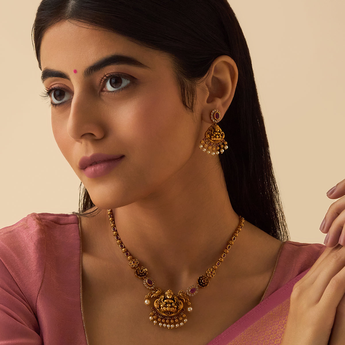 Browse through our women necklaces collection, and find that one special match to adorn your style. Whether it is the grandeur of luxury necklaces the finery of Mangalsutras, or the minimalist simplicity of a chain necklace, our collection has it all.