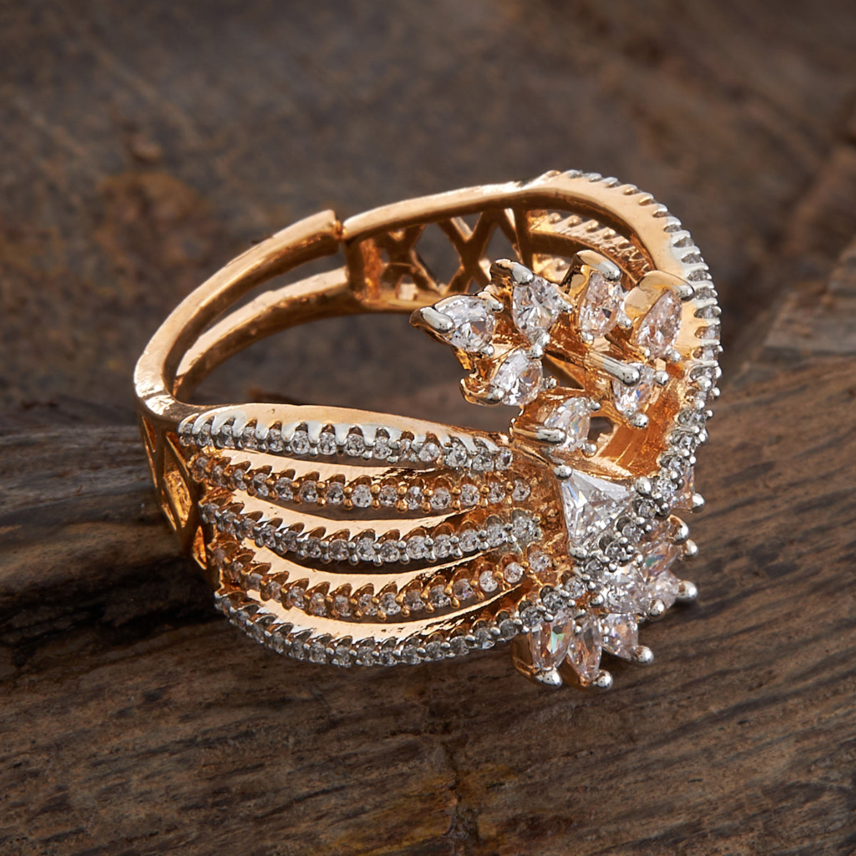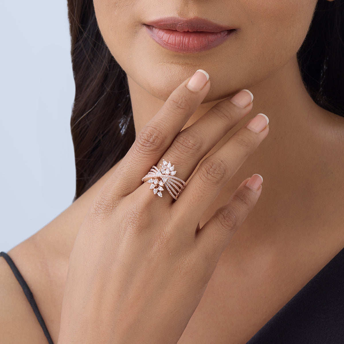 Wear this elegant zircon ring from our newest collection to look stylish. This adjustable ring is available in a rose gold finish and may be adjusted to any size to fit properly on your finger. Ideal gifting option for your mother, a close friend, or the love of your life.