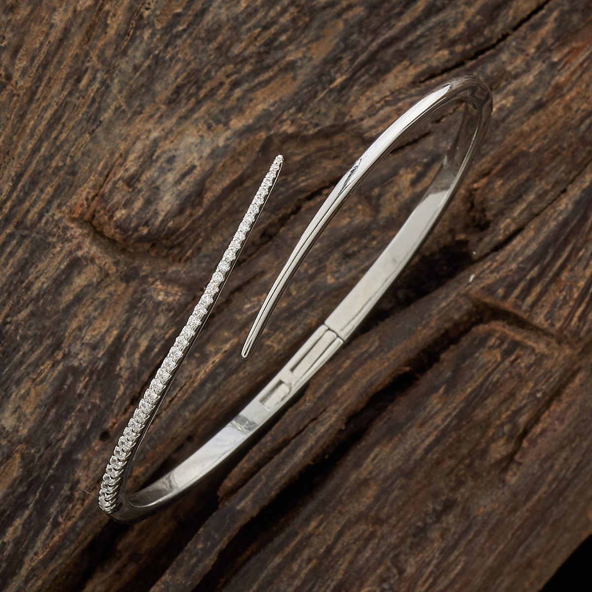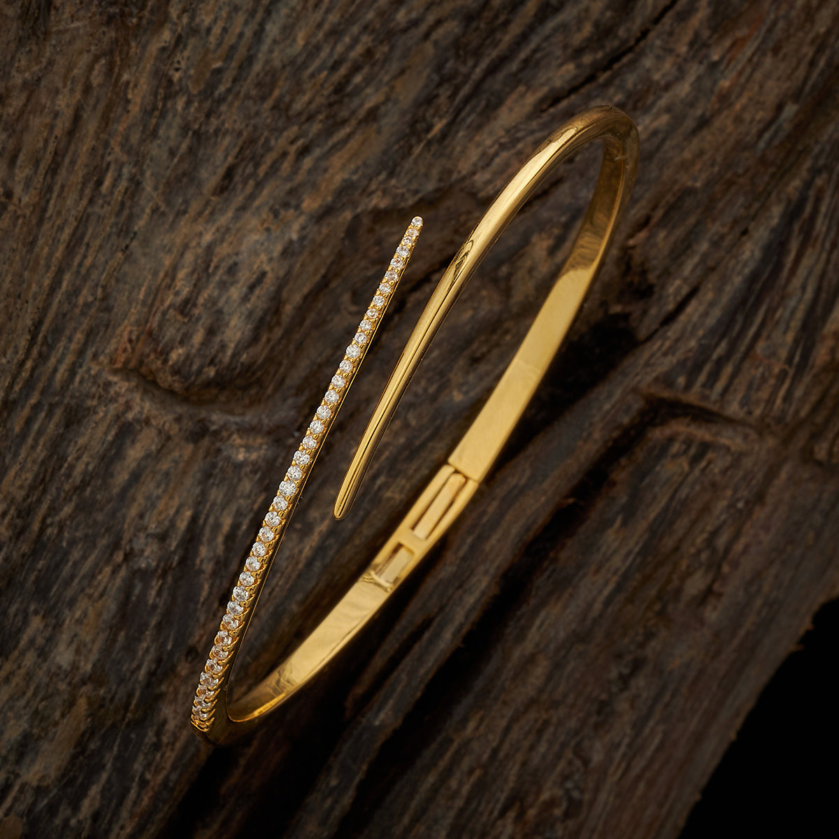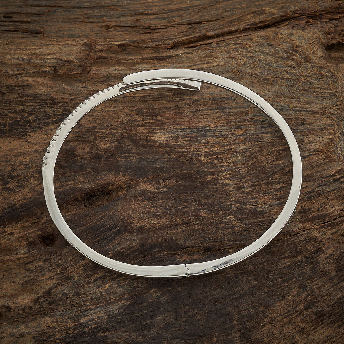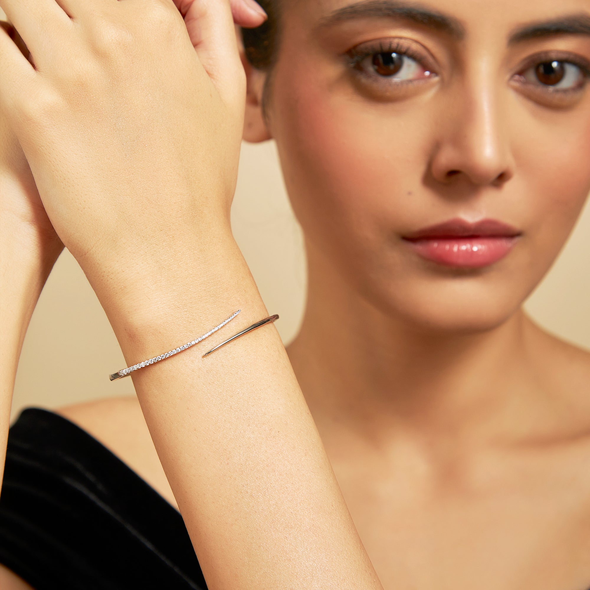 Designed to effortlessly complement any look, this zircon kada boasts a versatile adjustable feature, ensuring a perfect fit for every wrist. Crafted from copper alloy with precision and passion, this exquisite kada showcases shimmering white zircons set on two different finishes to choose from that radiate brilliance with every movement.