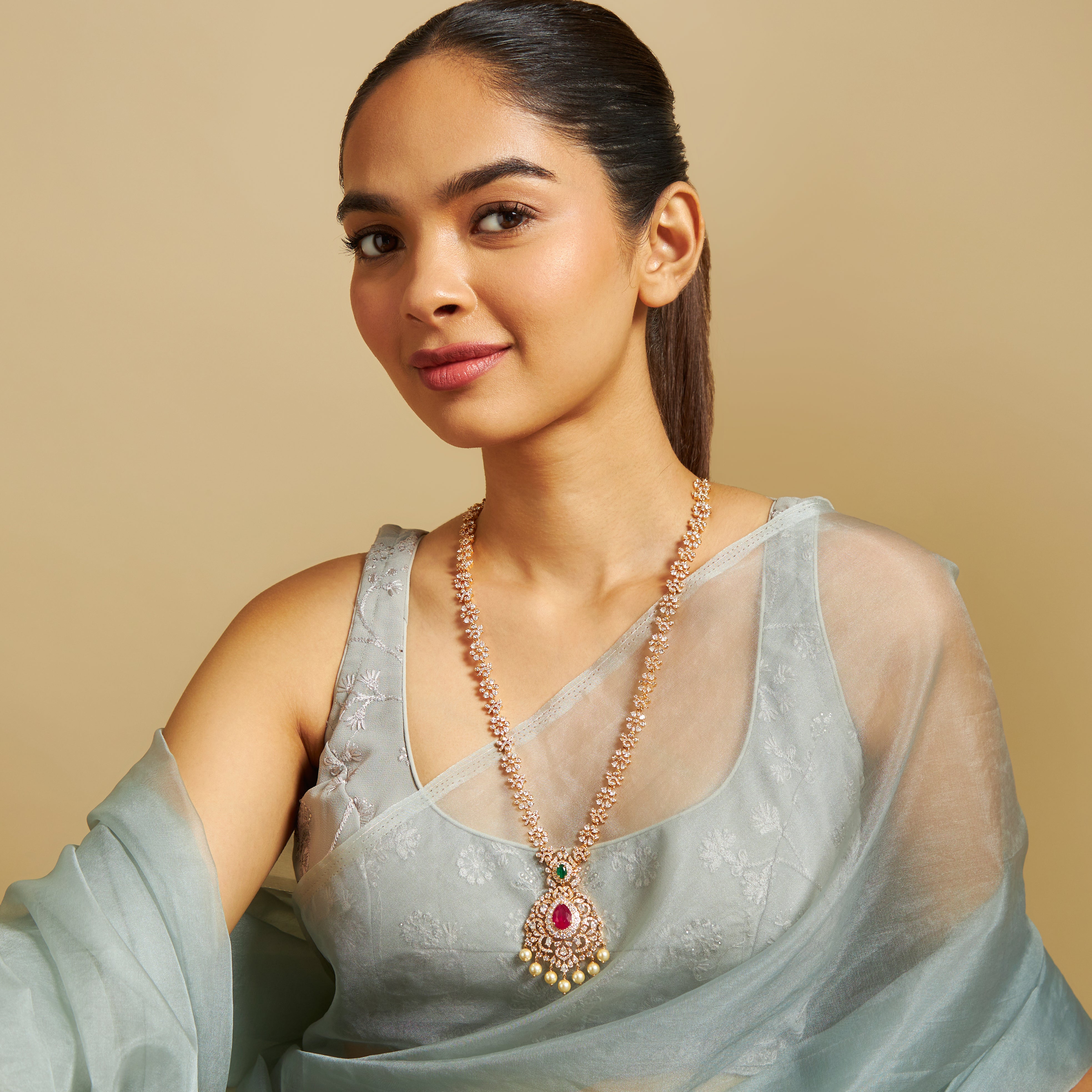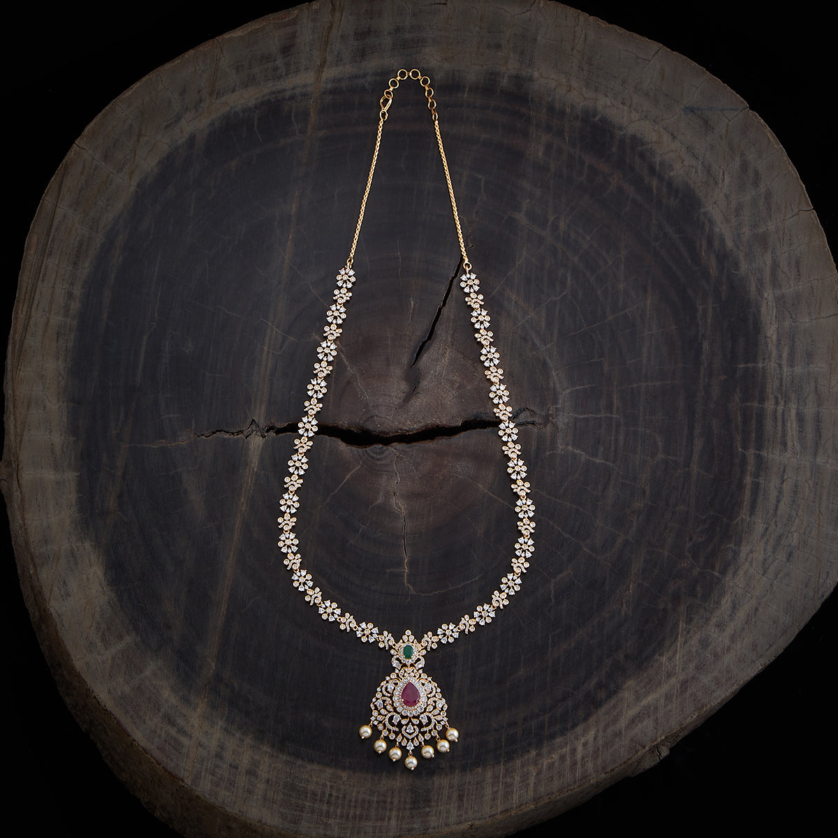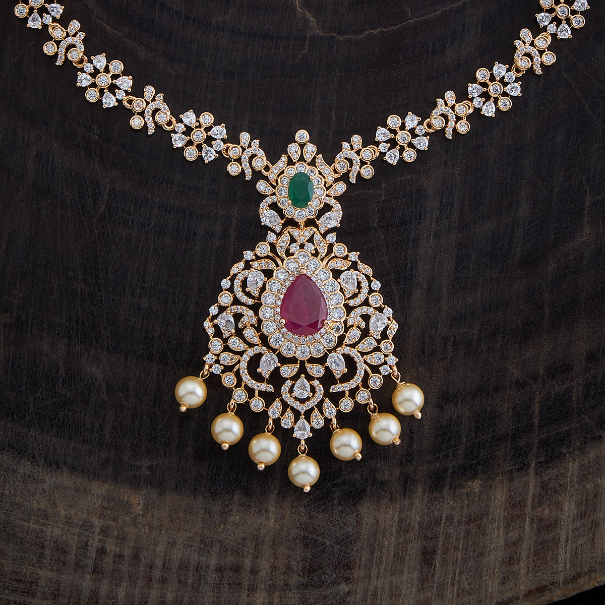 Complete your jewellery collection with the timeless elegance of our zircon necklace, a versatile accessory that adds a touch of elegance to any ensemble. Whether worn alone or layered with other pieces, this ruby-green stone-studded necklace is sure to enhance your look with its shimmering zircon stones and sophisticated gold-polished design.