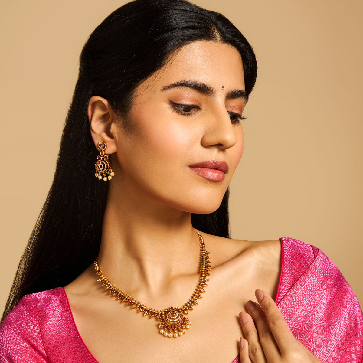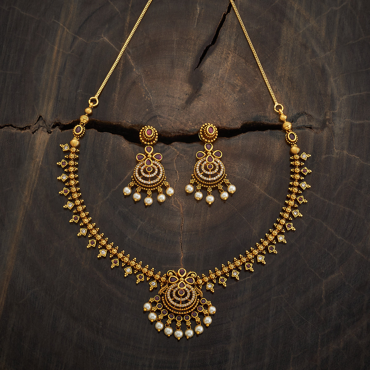 Brighten up your saree with our antique necklace from Kushal's Fashion Jewellery. This short necklace, with hanging earrings, features small ruby or green synthetic stones, white beads, and a gold polish. Pair it with your saree for a touch of vintage flair. Wear it and watch yourself shine.