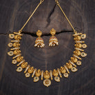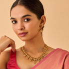 Add a touch of tradition to your look with this short antique necklace! Featuring ruby-green synthetic stones and beads with a rich gold polish, it comes with matching jhumkas for extra flair. Perfect to pair with sarees or lehengas, this set is your go-to for a classic, elegant style on any occasion.