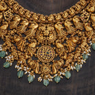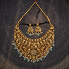 This antique necklace set features a short necklace with matching hanging earrings adorned with ruby-green synthetic stones, beads, and a lustrous gold polish. Its rich design makes it the perfect accessory to pair with a heavy silk saree or an elegant anarkali suit, adding a regal touch to your traditional look.