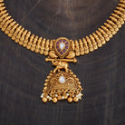 This antique necklace showcases detailed gold-tone designs with traditional ruby-coloured stones. Its adjustable chain ensures ease of wear. Pair it with embroidered sarees or festive lehengas to elevate your look. It comes with matching antique earrings featuring a push-back closure. The jhumkas crafted from copper alloy offer long-term durability.