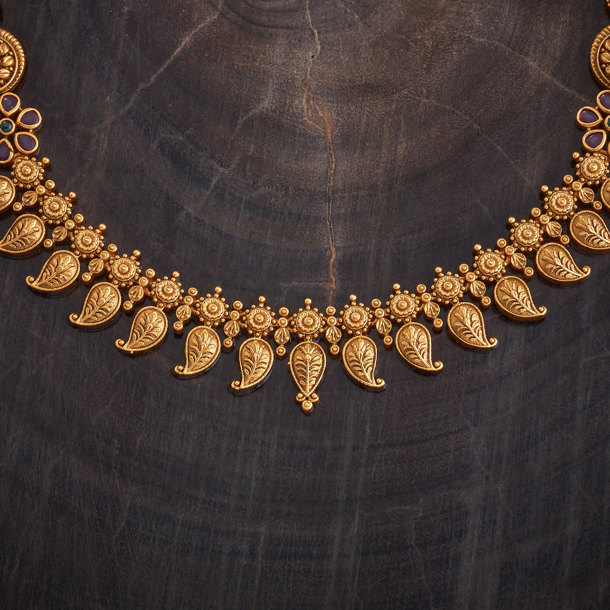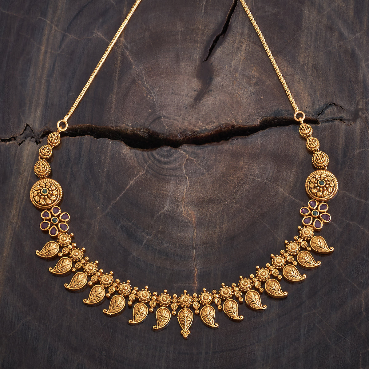 This antique short necklace, featuring vibrant ruby-green synthetic stones and rich gold polish, adds a touch of timeless elegance to your ensemble. Its classic design makes it the perfect accessory to pair with Indian outfits, enhancing your look for weddings, festivals, or any traditional occasion with its sophisticated charm.