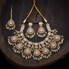 Most sets offer a necklace and a pair of matching earrings, but our latest Kundan set comes with a pair of matching hanging earrings, a necklace, and an elegant Tikka. This set is all you need for this wedding season as it has everything you need. The Victorian polish on the Kundan and green stones is the cherry on top.