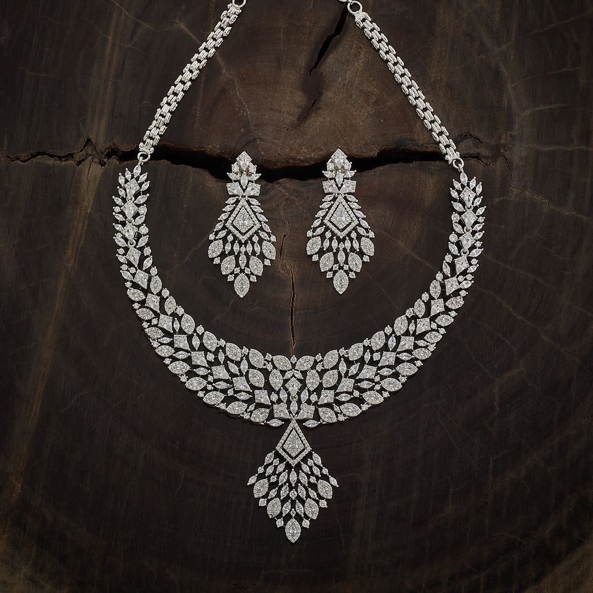 Outshine everyone with this stunning white zircon necklace from Kushal's Zircon Jewellery Collection. Crafted with rhodium or rhodium-gold finishes to choose from, it adds a touch of sophistication to any outfit. This versatile piece makes a lasting impression and is perfect for special occasions.