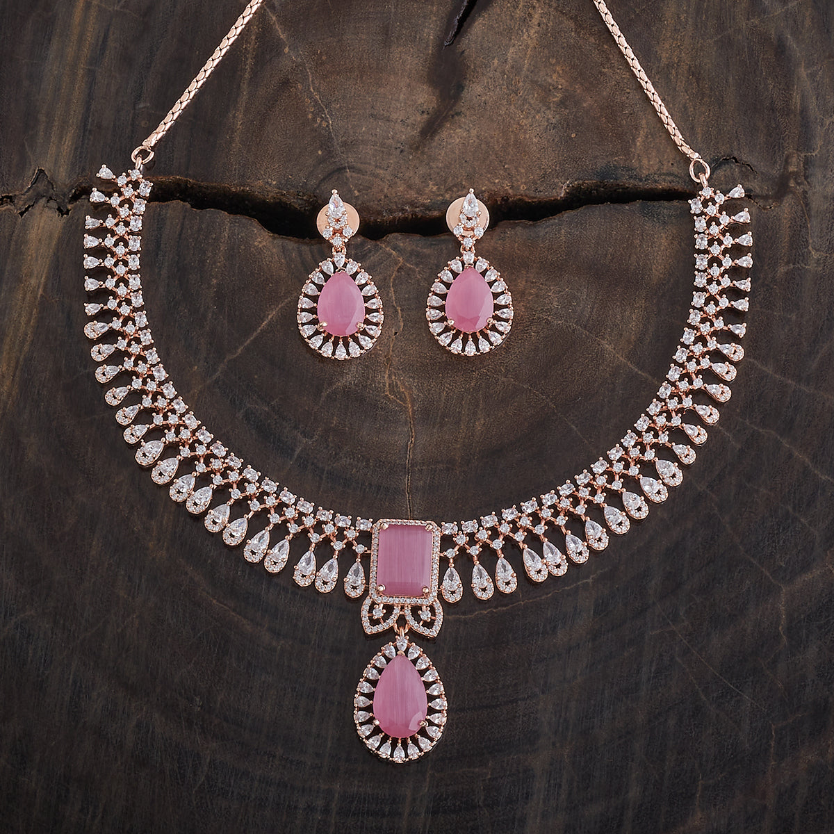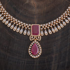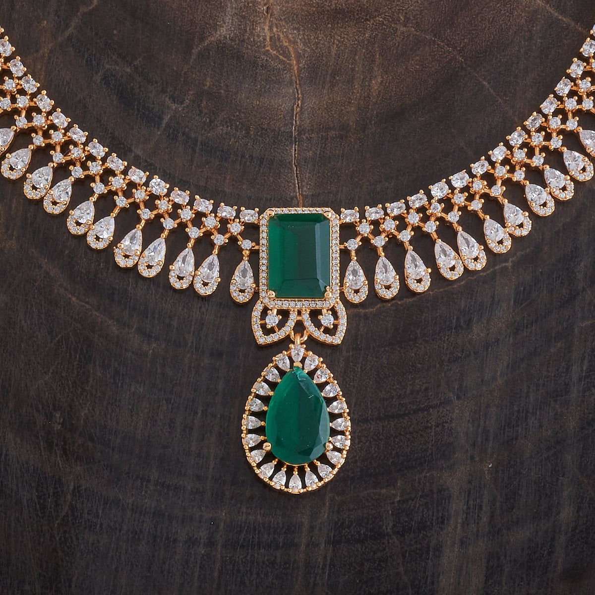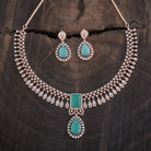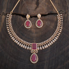 This sophisticated zircon necklace set from Kushal's Fashion Jewellery comes in a variety of vivid hues, including green, mint, pink, and ruby. The brilliant stones are set in a gold or rose gold-polished copper alloy. The short necklace design has matching hanging earrings with safe push-back closures and an adjustable chain for a snug fit.