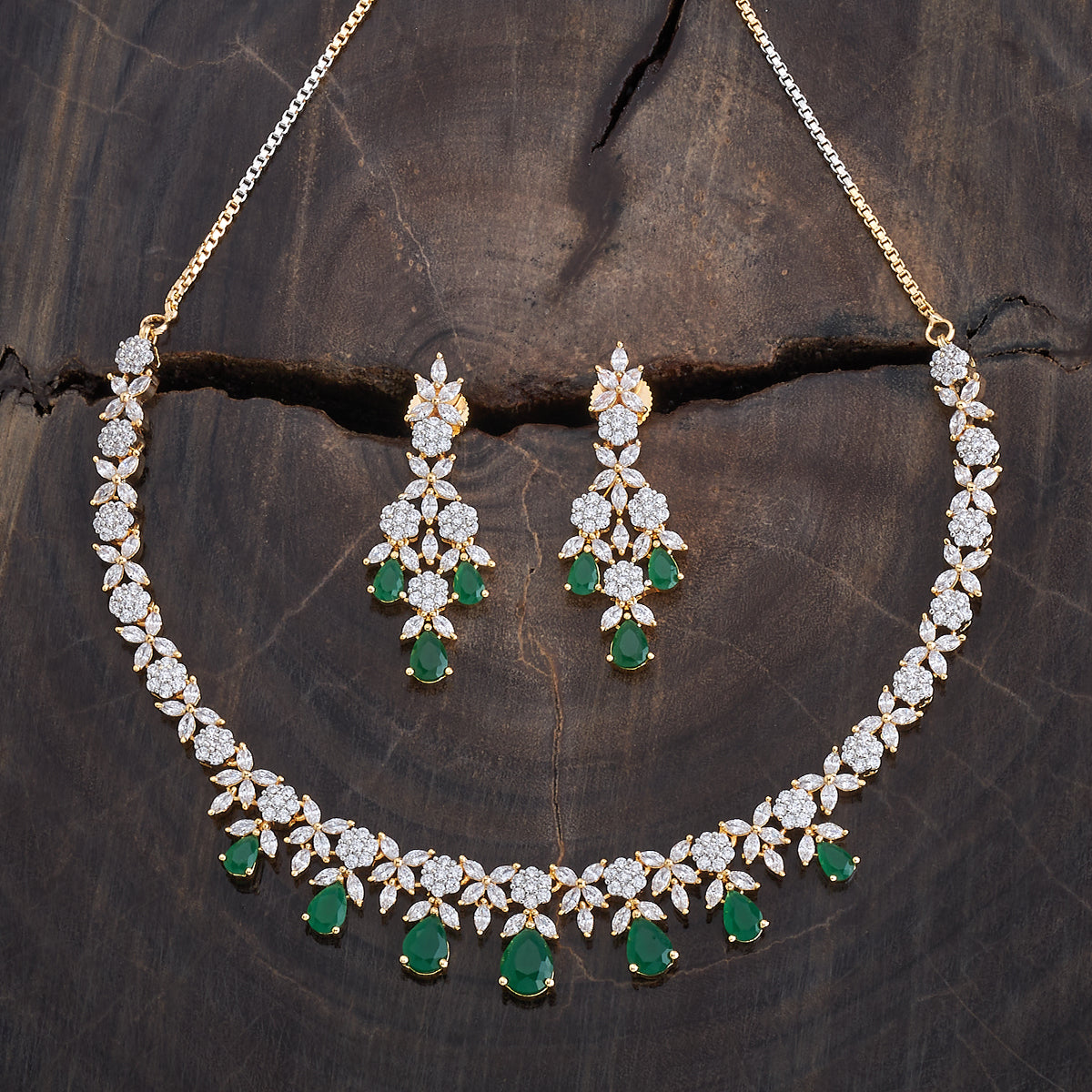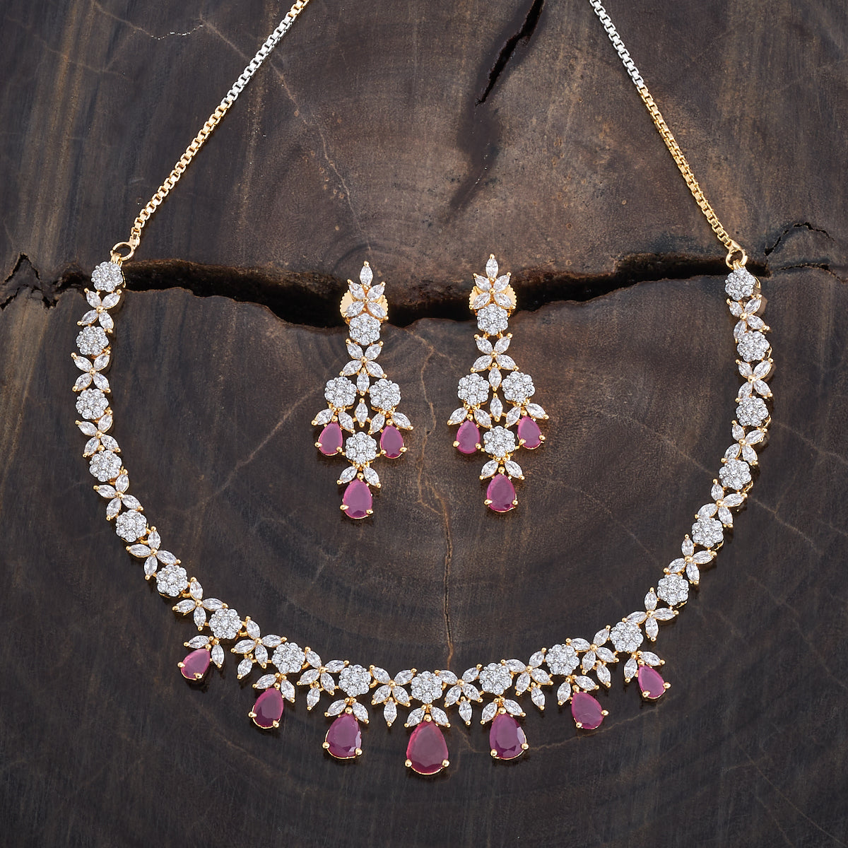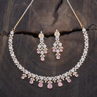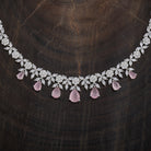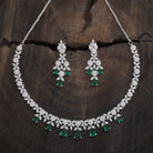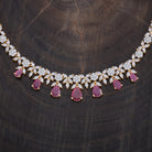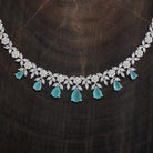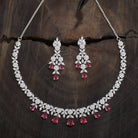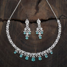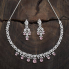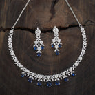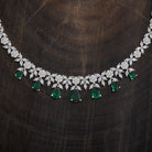A dazzling zircon necklace with brilliant stones in a polished rhodium-gold tone finish. Its adjustable chain offers secure wear. Pair it with evening gowns for a chic look, or style it with ethnic wear for elegant versatility. Its matching zircon earrings, featuring push-back closure, make for a cohesive ensemble.