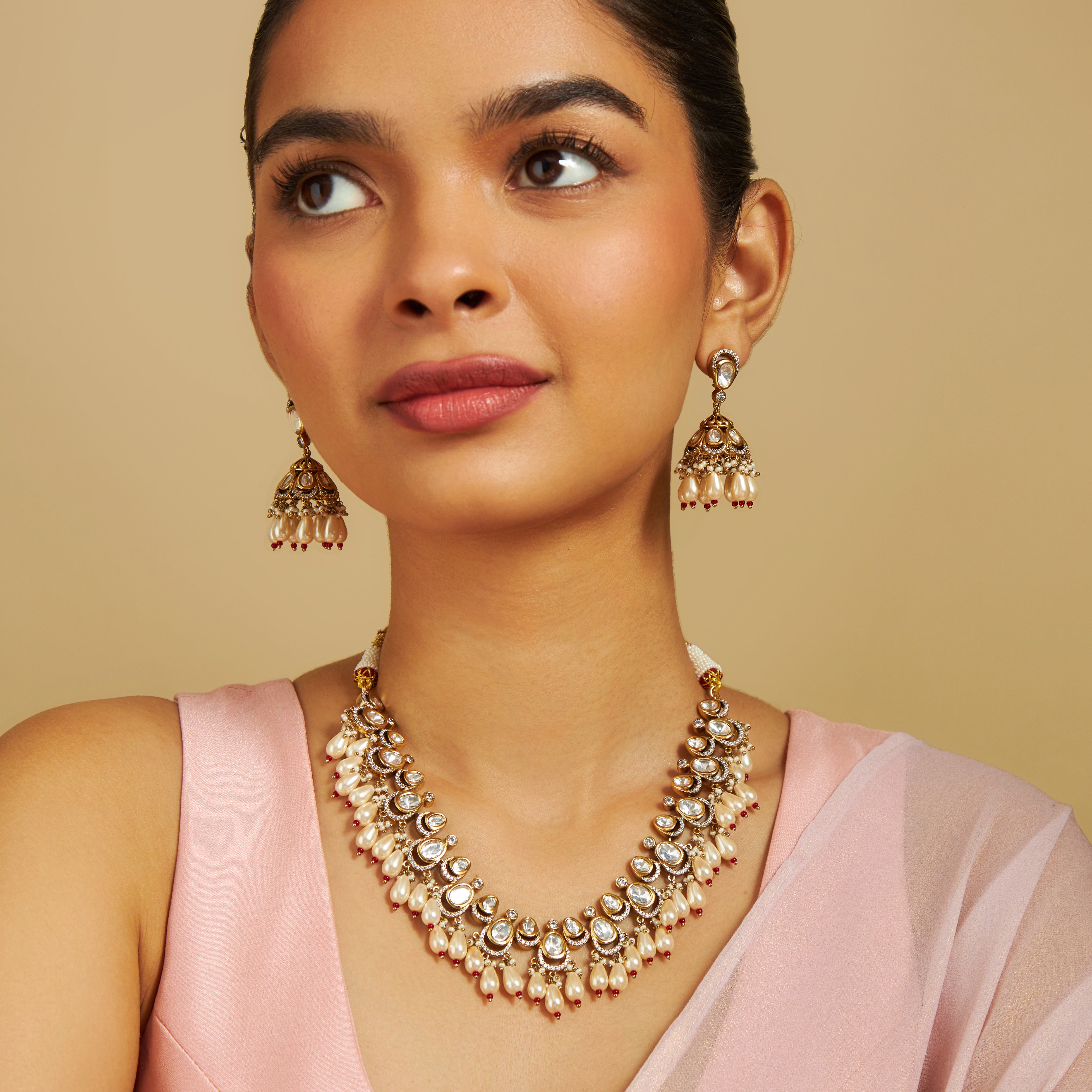 Not sure which short necklace length is right for you? Start by considering the neckline of your clothing. For example, a 16-inch short chain necklace looks stunning with a crew neck or strapless top, while a 14-inch choker-style piece pairs well with deeper cuts. If layering, consider mixing textures or combining a short kundan necklace with longer pendants for a trendy, bohemian look.