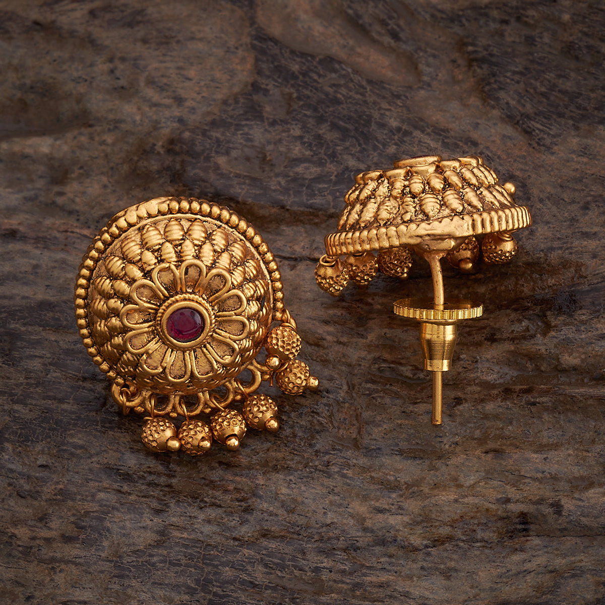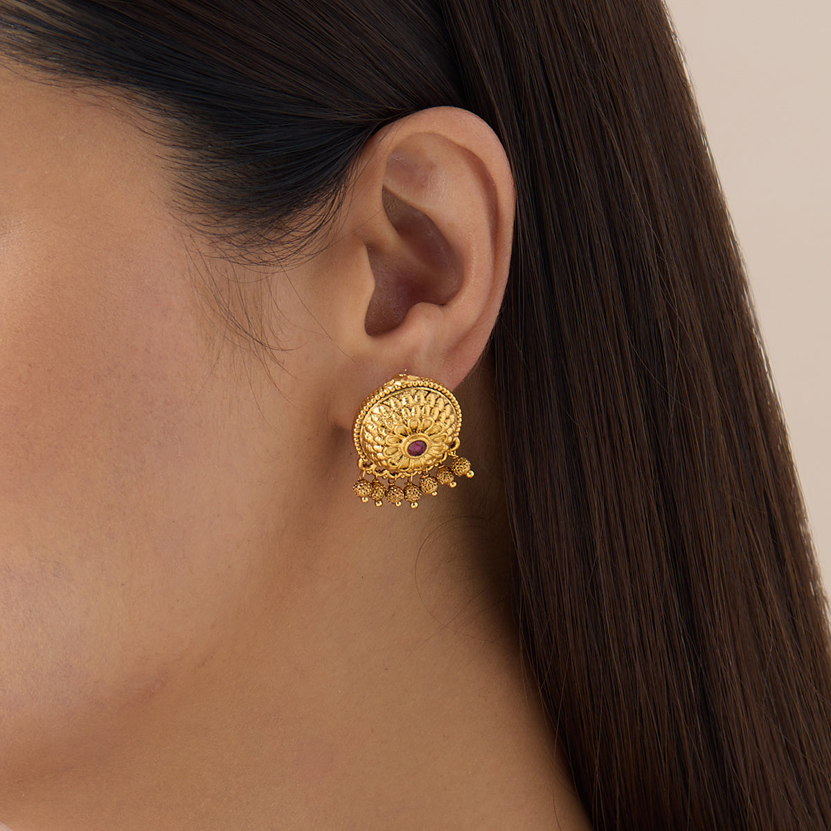 Frame your face with the elegance of our first Antique Earring. This intricately designed earring features antique detailing of ruby stones and a timeless appeal of gold polish. Whether worn as a standalone piece or paired with other accessories, the Antique Earring complements a variety of looks.
