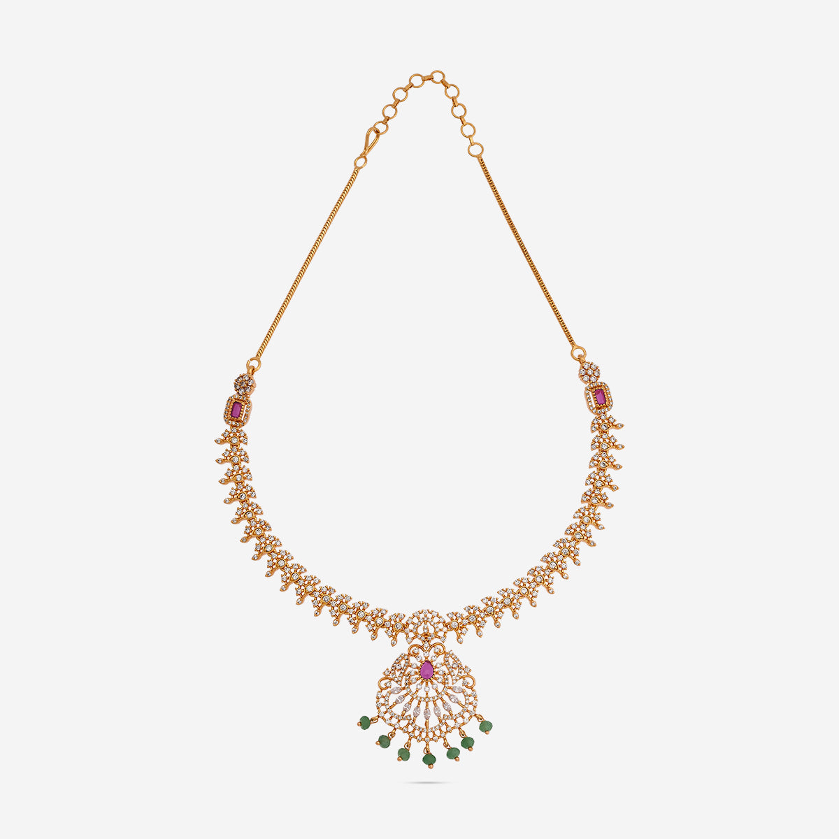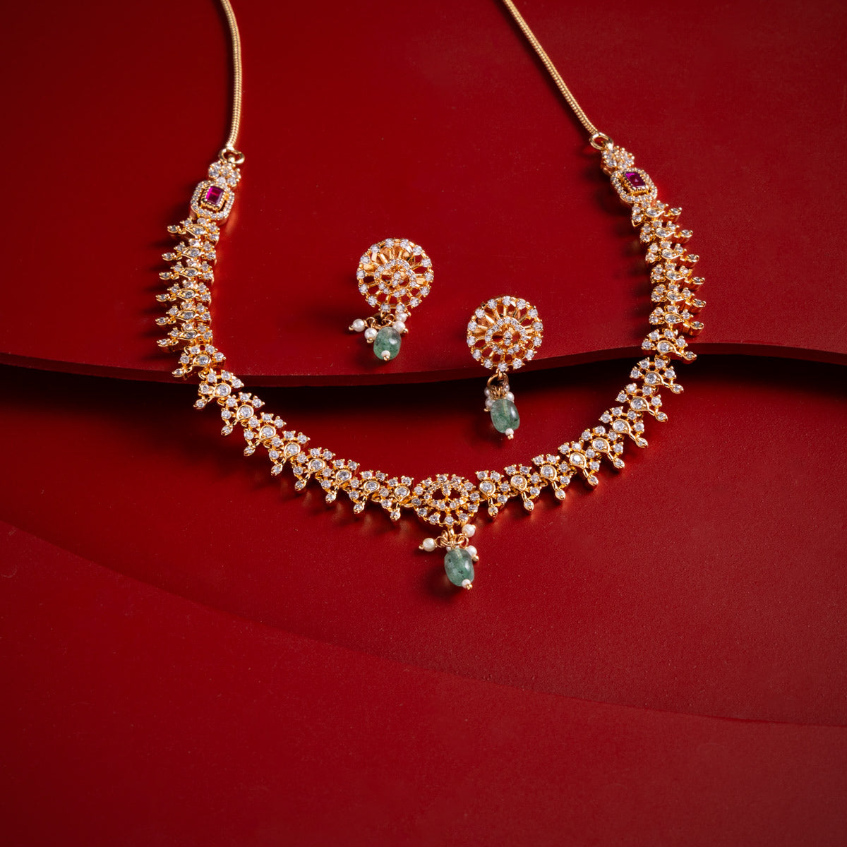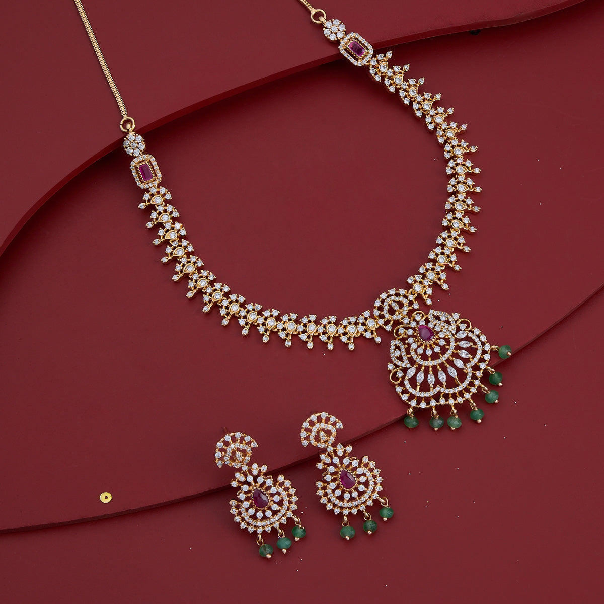 - For a bridal ensemble, go for elaborate zircon necklace designs that sparkle under the lights.