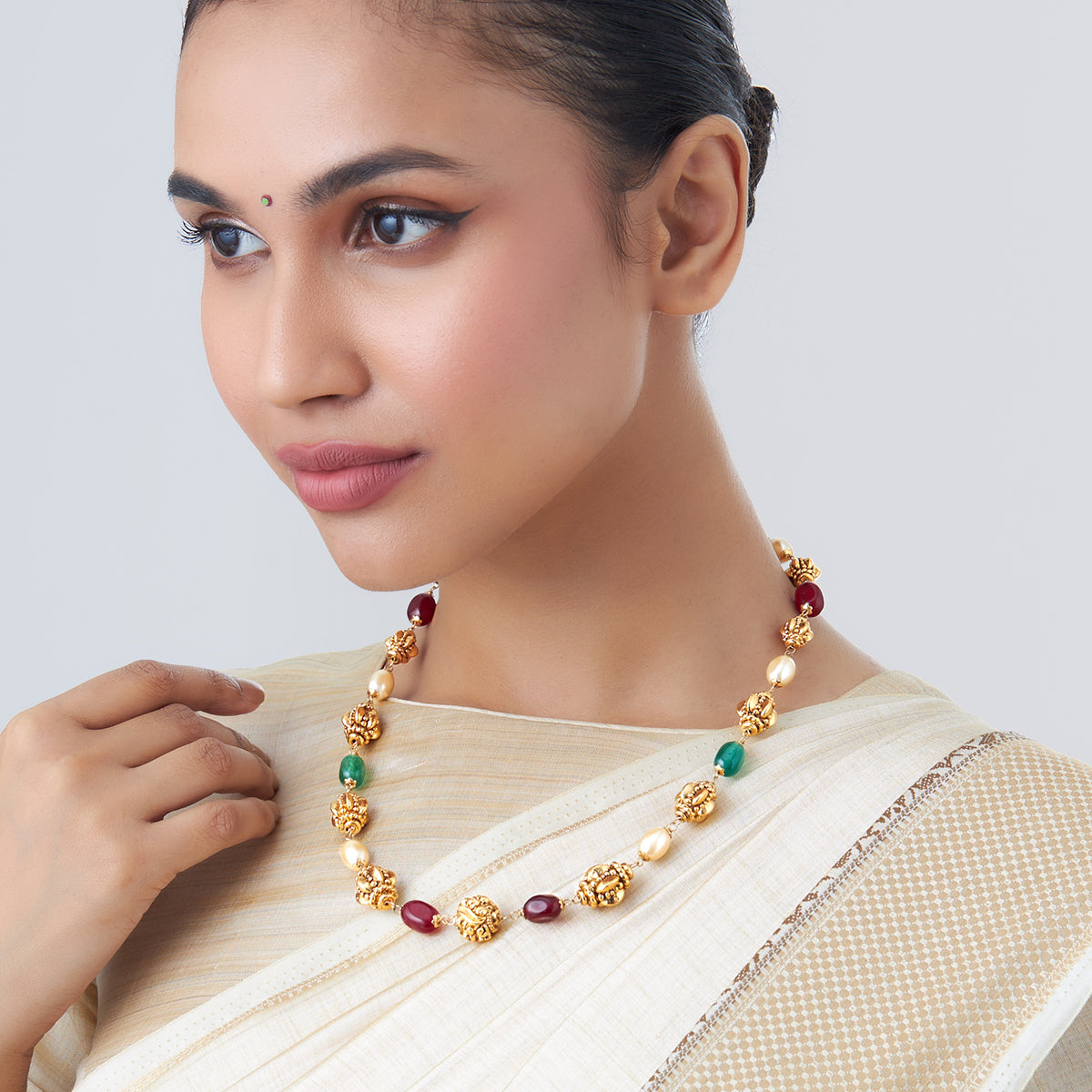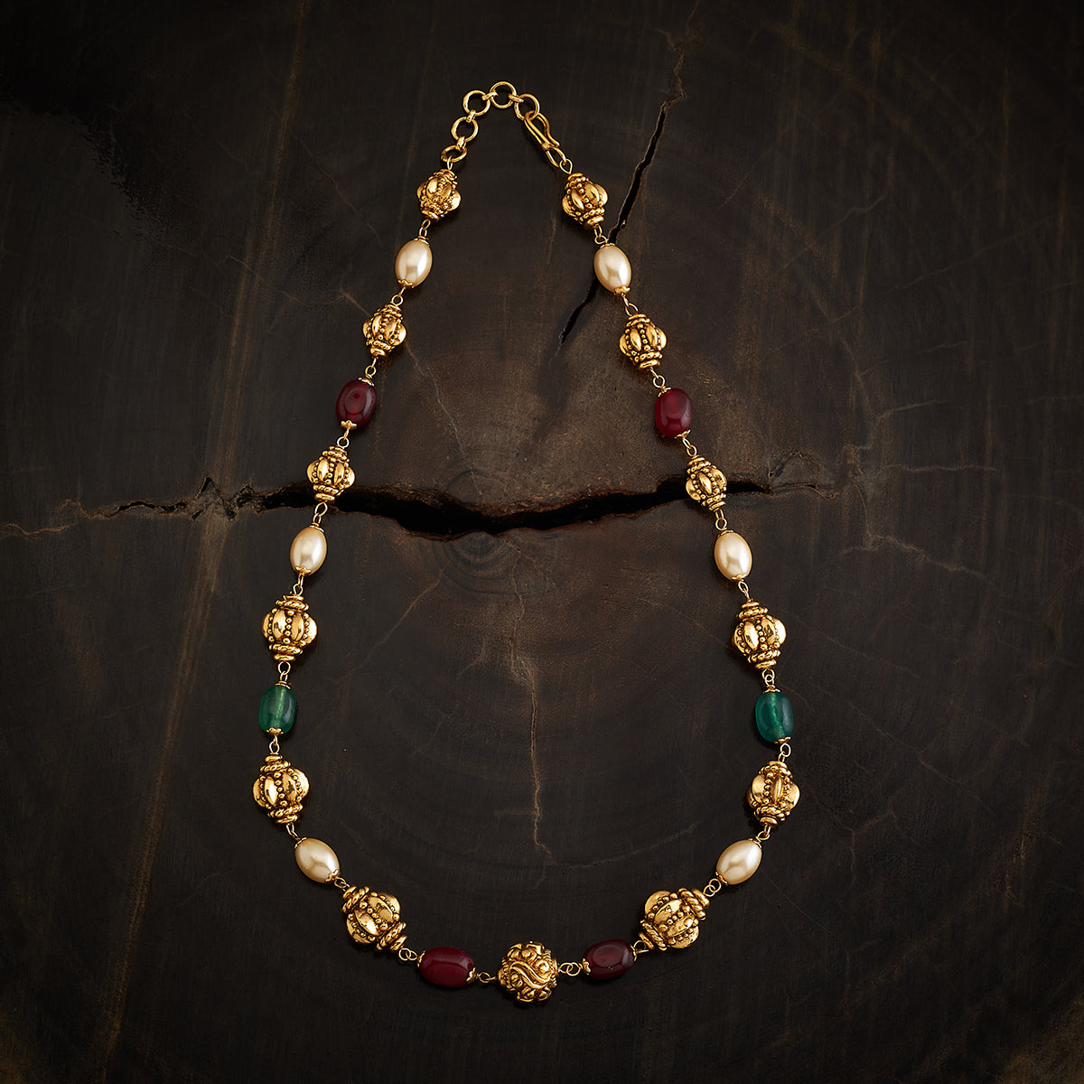 Wearing multi-coloured accessories removes the hassle of pairing them with outfits of all colours and festivals. Allow our latest antique Mala to give you this freedom this wedding season. This Mala comes with green, ruby, and pearls for a multi-coloured look that effortlessly blends well in all occasions and events.