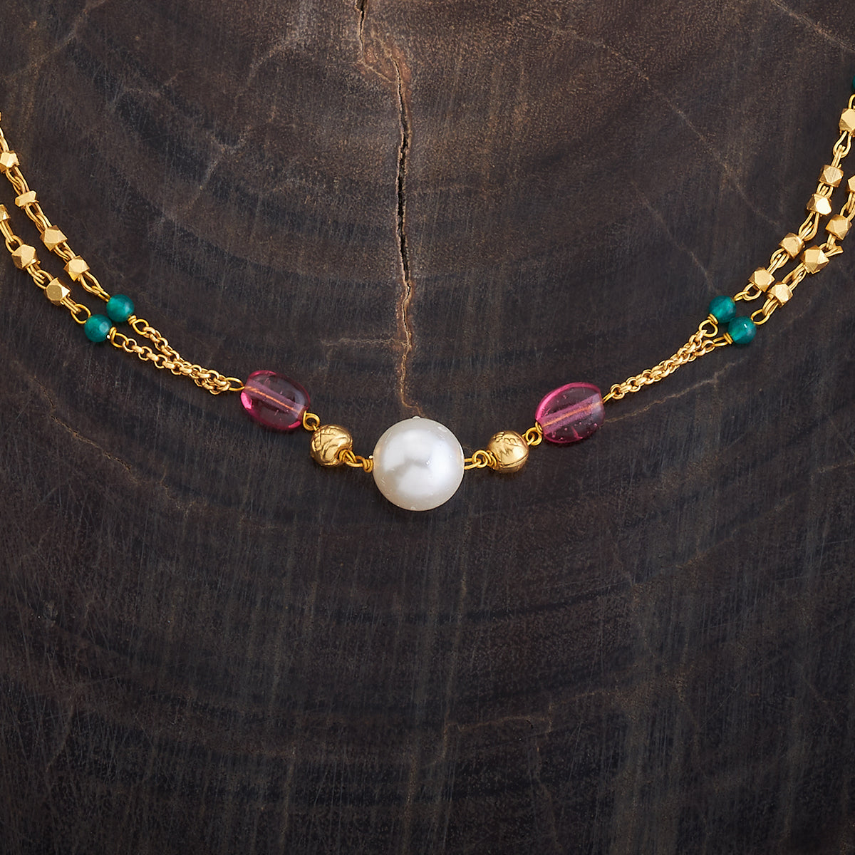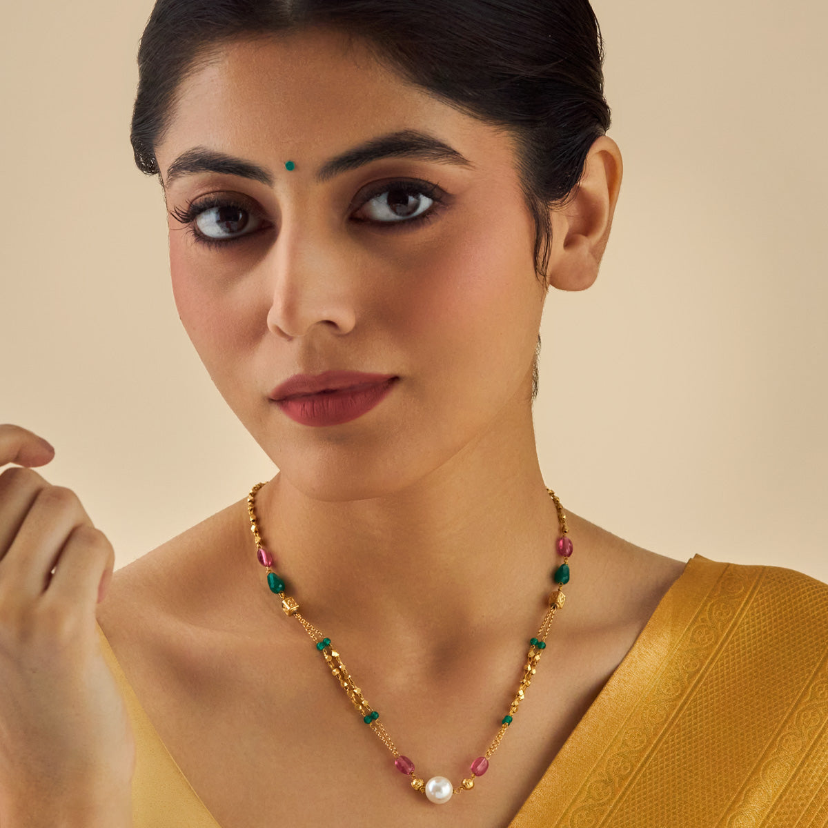 Radiate traditional charm with Kushal's antique mala. Featuring a vibrant ruby-green colour combination and a luxurious gold polish, this piece adds a unique touch to any outfit. Perfect for both casual and festive occasions, it's a versatile addition to your jewellery collection. Whether you're dressing up or keeping it casual, this mala is a must-have!