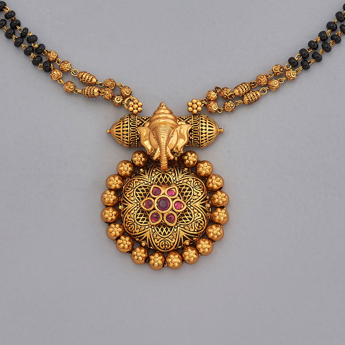 Add a touch of traditional elegance to your ensemble with the antique mangalsutra, a symbol of marital bliss and cultural heritage. Crafted with intricate detailing and adorned with sparkling ruby stones, this gold-polished mangalsutra is perfect for adding a touch of tradition to your bridal ensemble or everyday attire with grace and style. Step into tradition with our antique temple mangalsutra collection. Featuring intricate temple motifs on long chains, each piece is a testament to craftsmanship and cultural heritage.