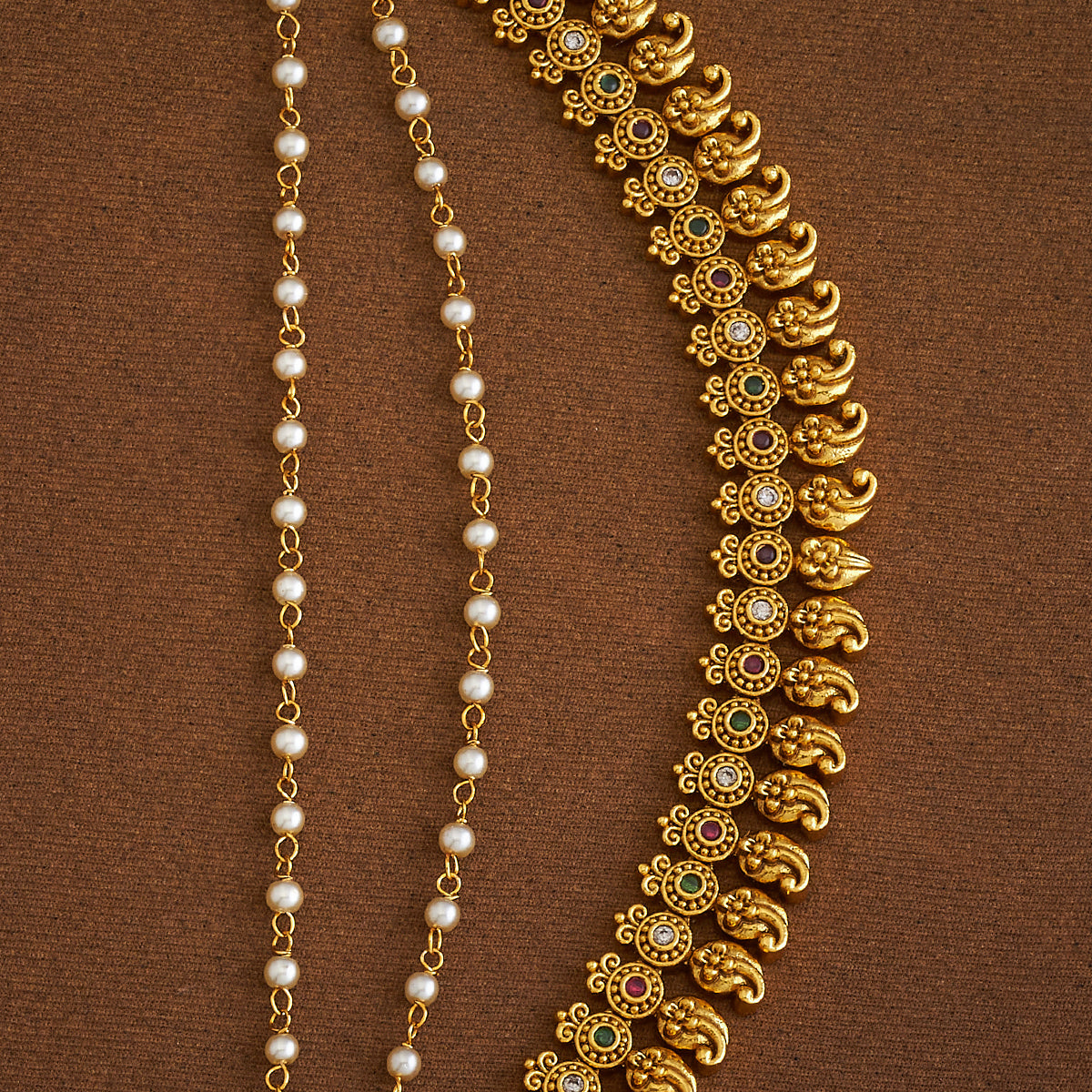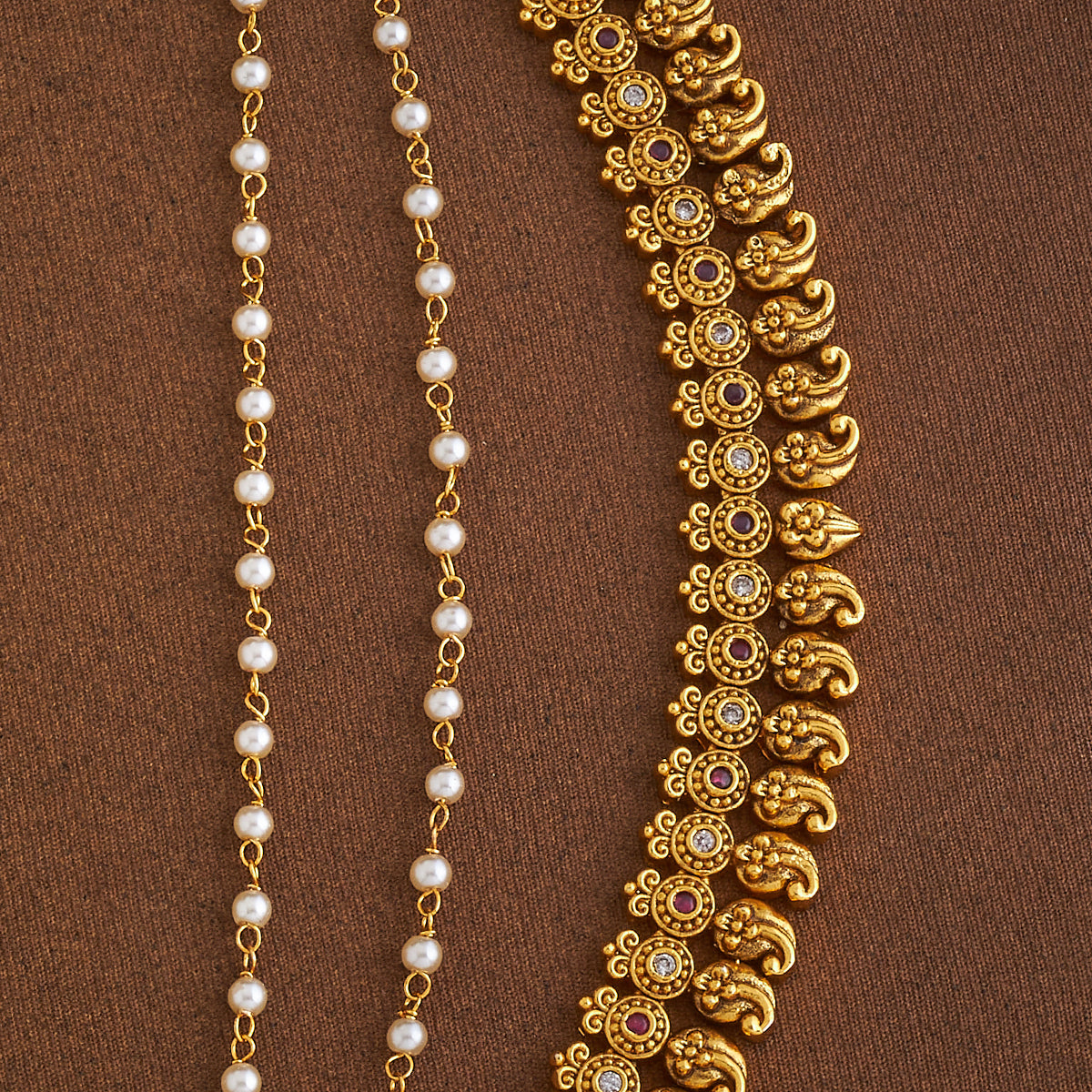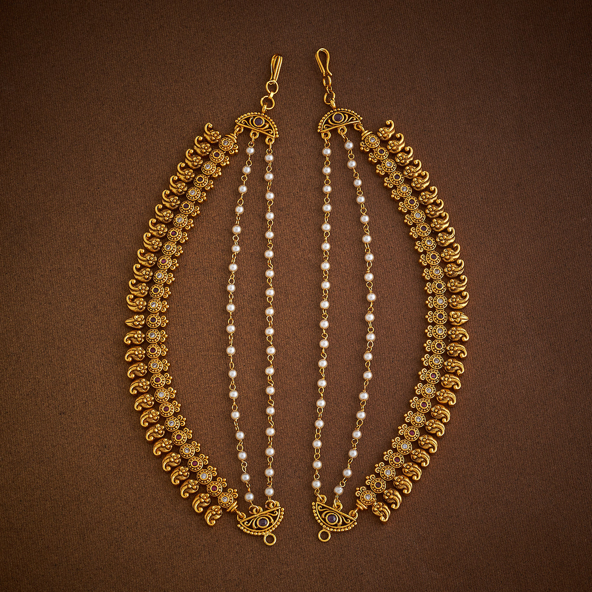 Stop the show with these incredible matil! Delicately designed with beads and intricate metalwork, these go with any outfit, whether it's a saree or a Western evening gown. You can find these in two different stone colours- ruby and a mix of ruby and emerald stones.