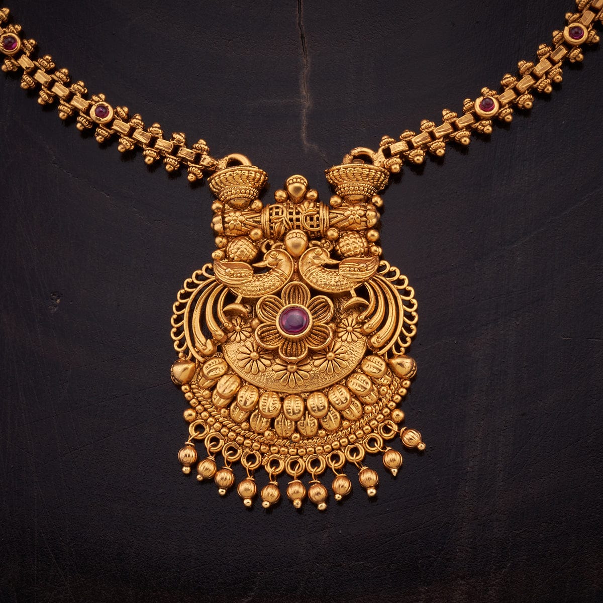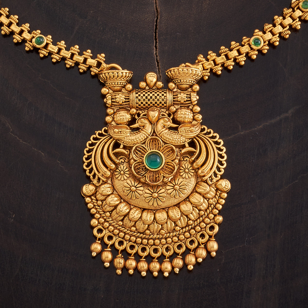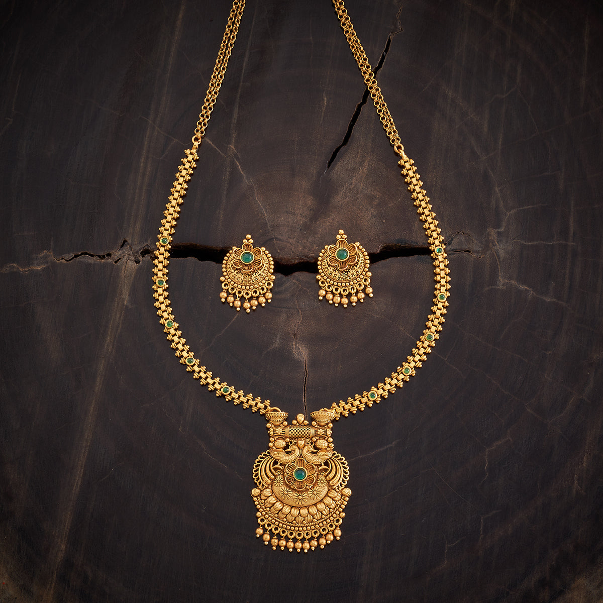 Give your look a classical touch with this antique necklace set from our collection. This gorgeous green beauty has copper alloy in the base and fine stonework, making it look precious. This necklace set goes well with any ethnic outfit you like and adds a sumptuous touch to your look effortlessly!