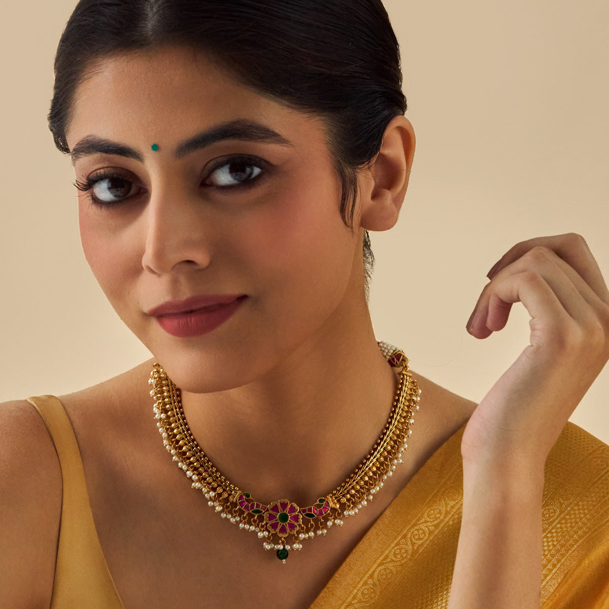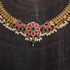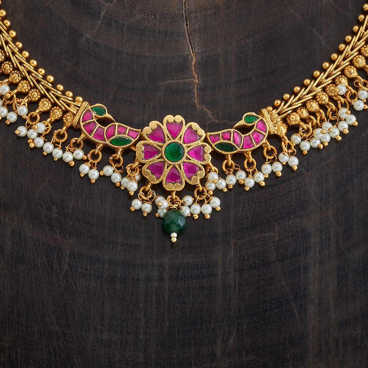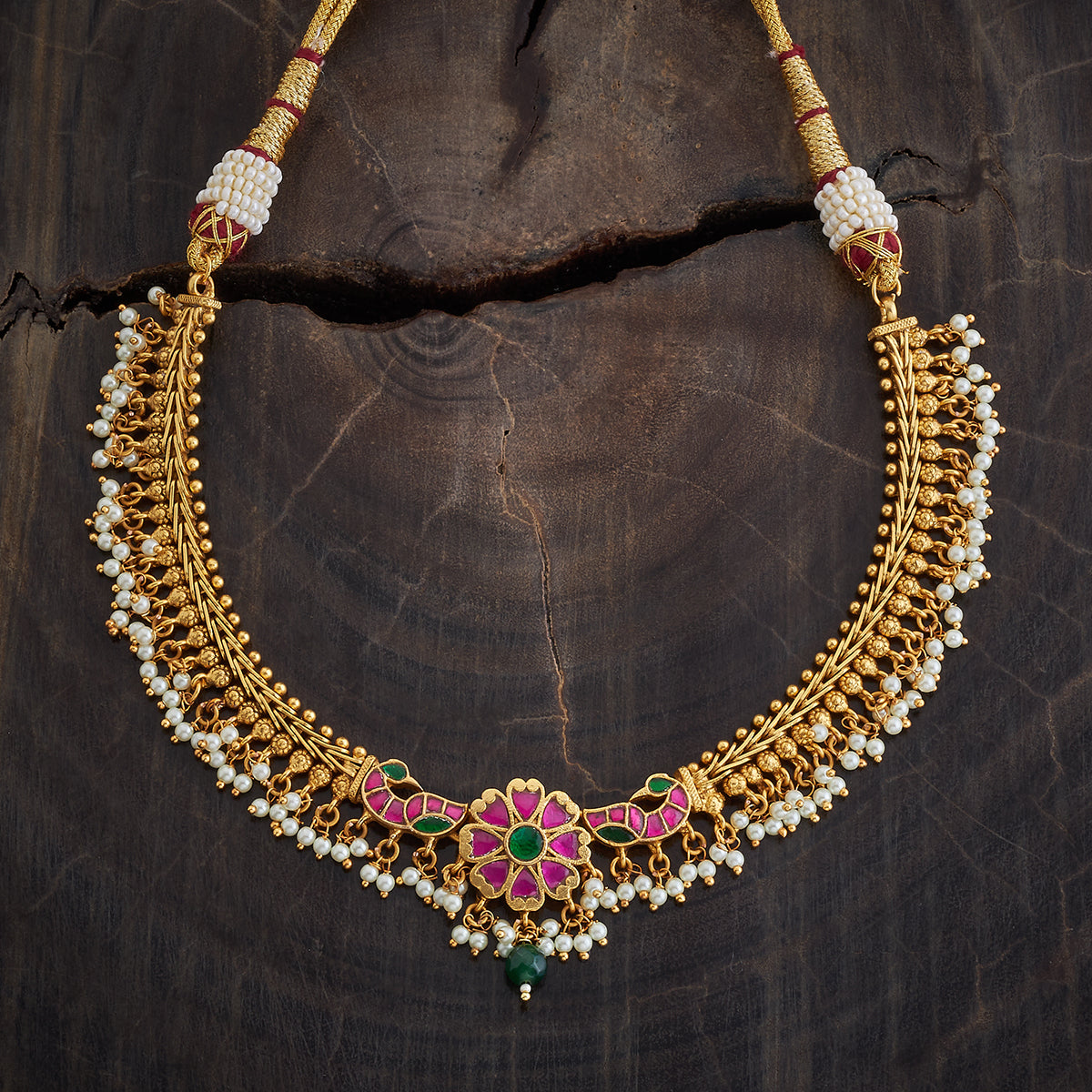 Elevate your style with the antique necklace, featuring a stunning combination of ruby-green synthetic stones set in a gleaming gold-polished copper alloy. This short necklace comes with an adjustable thread, ensuring a perfect fit. Ideal for festive occasions or enhancing everyday looks, it's a must-have accessory for your collection.
