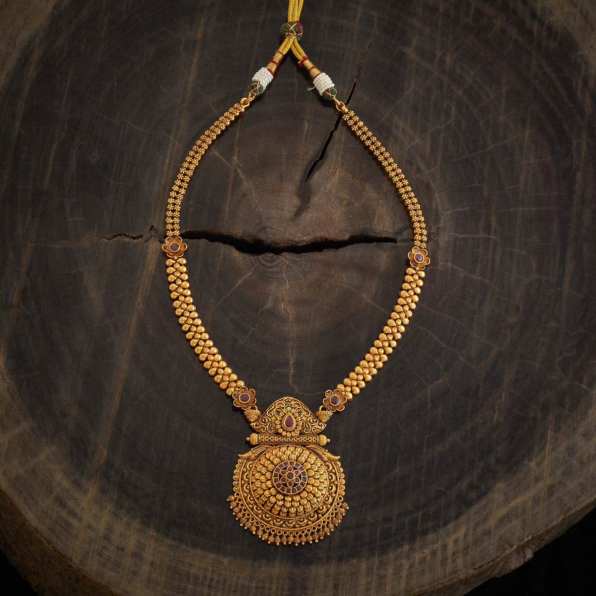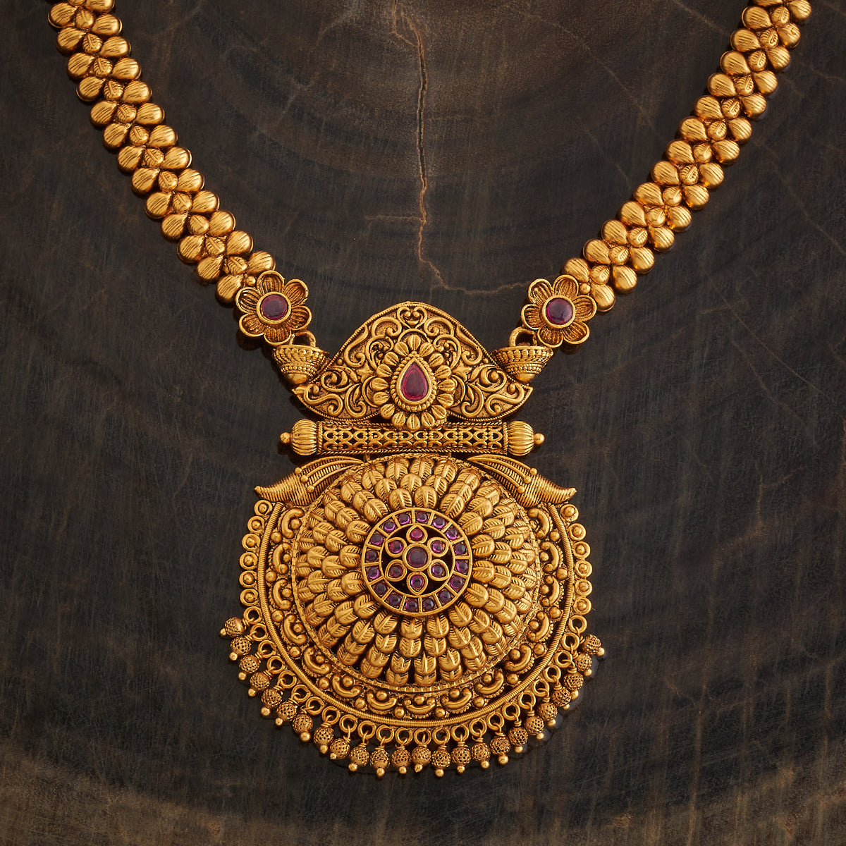 Enhance your ethnic ensemble with our antique haaram necklace. Featuring an adjustable thread and adorned with ruby synthetic stones interspersed with luxurious gold polishing, it adds a touch of timeless elegance to any Indian outfit. Perfect for cultural gatherings and festive occasions, this piece promises an authentic and sophisticated look.