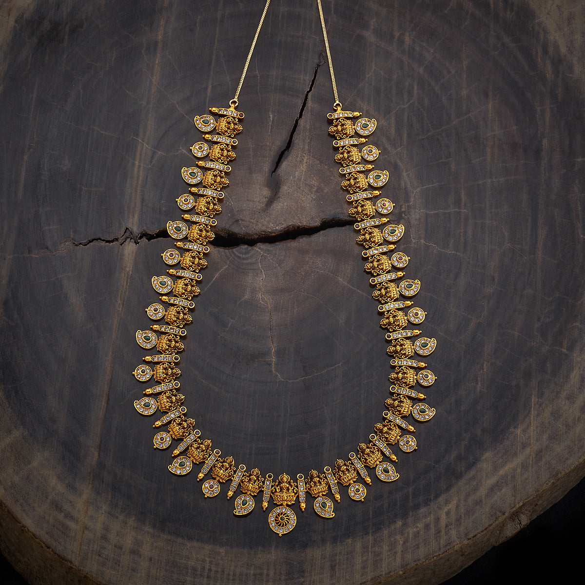 Make a bold statement with this stunning long antique necklace, featuring ruby-green synthetic stones and sparkling zircon accents, all beautifully set in gold polish. Its royal and traditional design adds an air of elegance to any outfit, making it the perfect accessory for weddings and festive occasions.