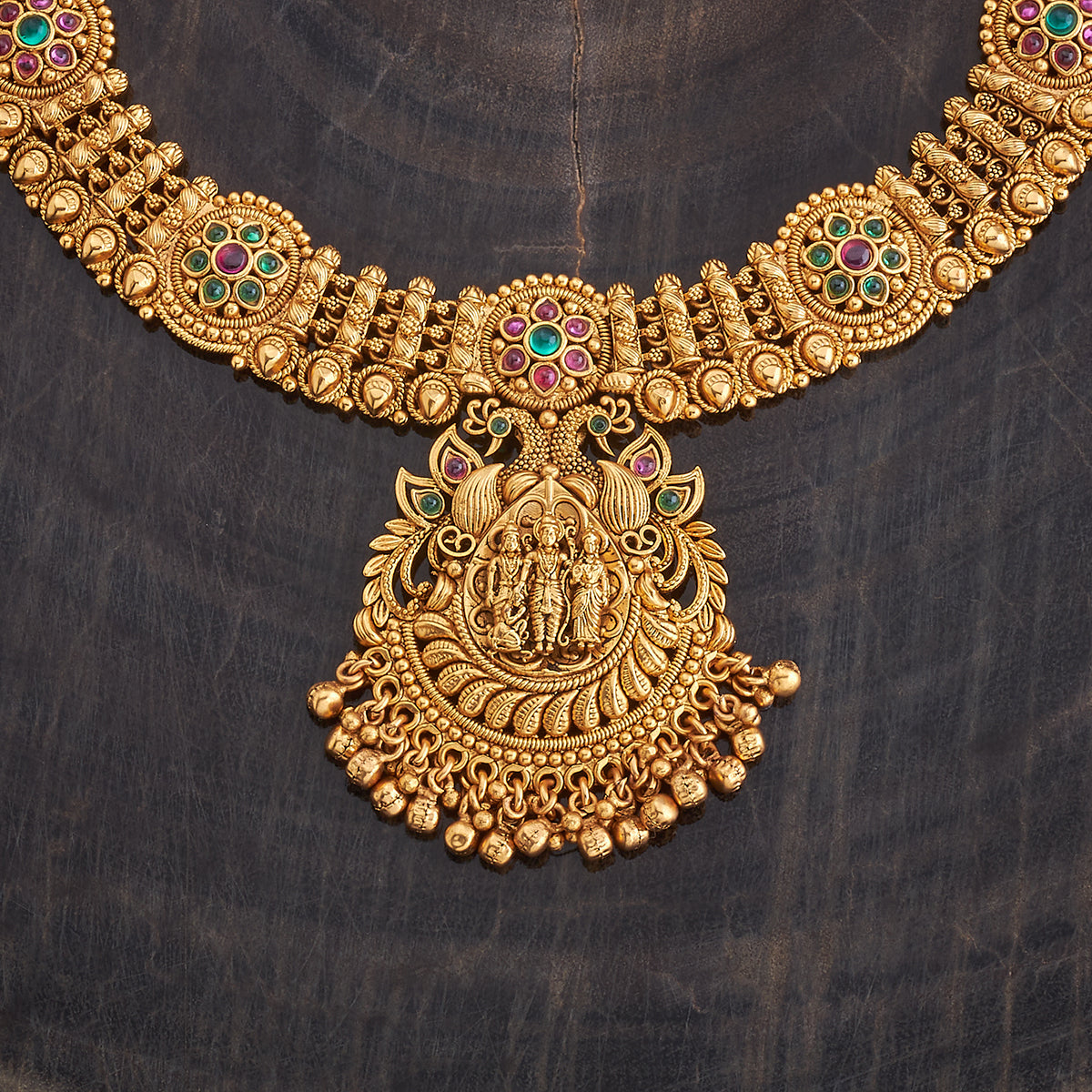 This antique short necklace, paired with matching hanging earrings, features vibrant ruby-green synthetic stones and a rich gold polish. Its intricate design and elegant charm make it the perfect accessory to pair with sarees, adding a royal touch to your traditional look for weddings, festivals, or any special occasion.