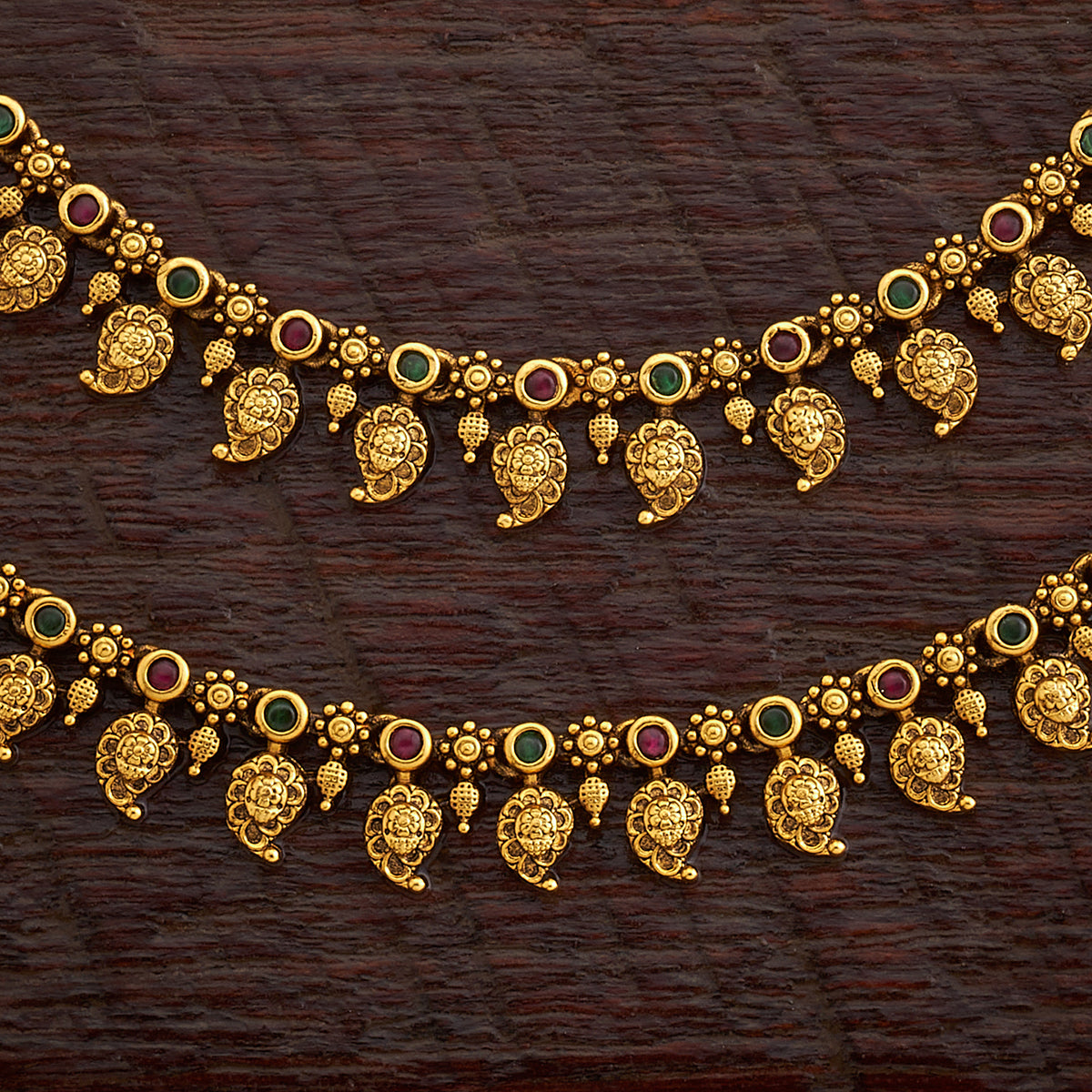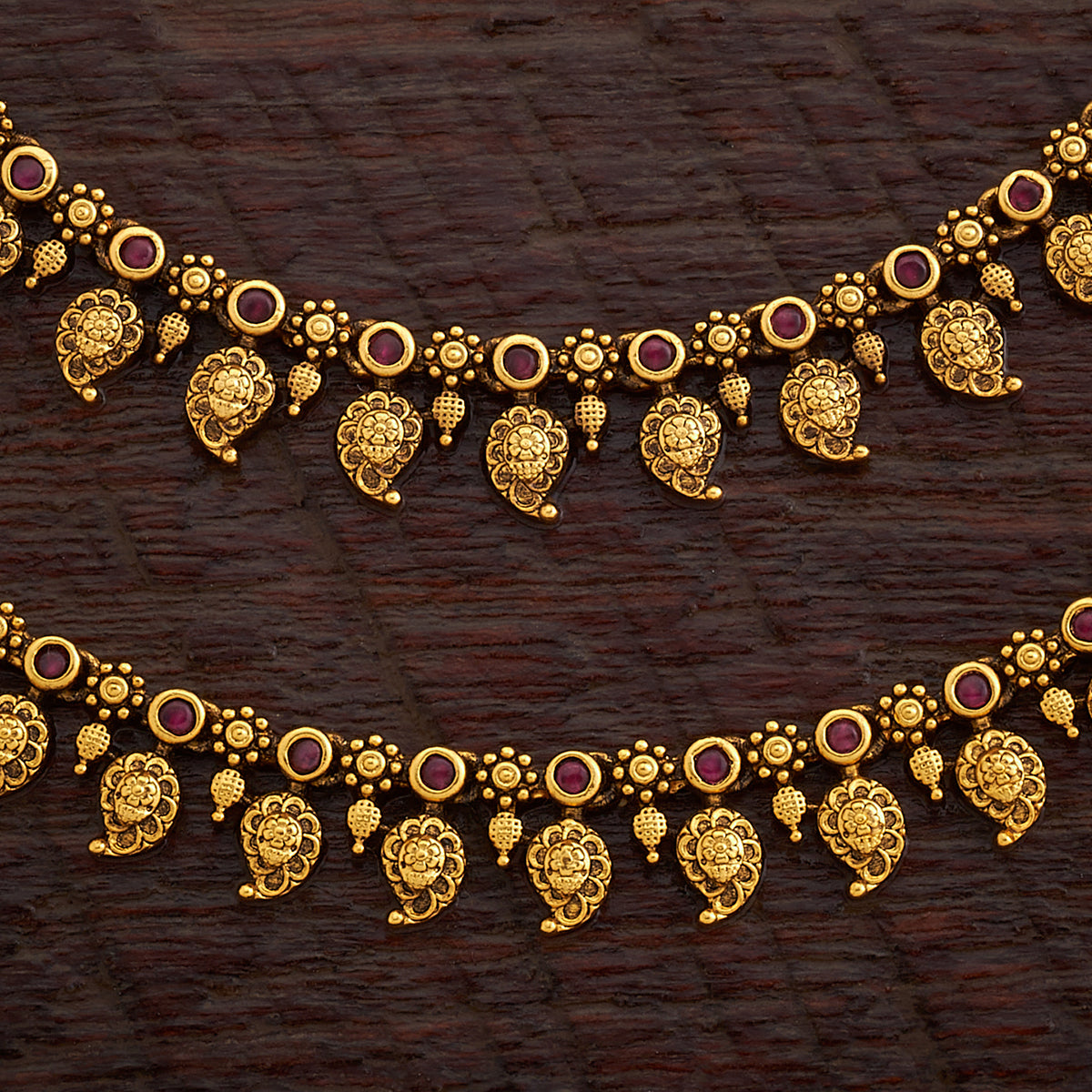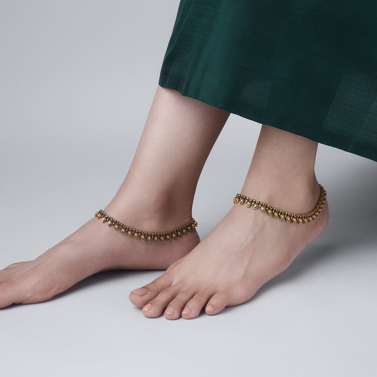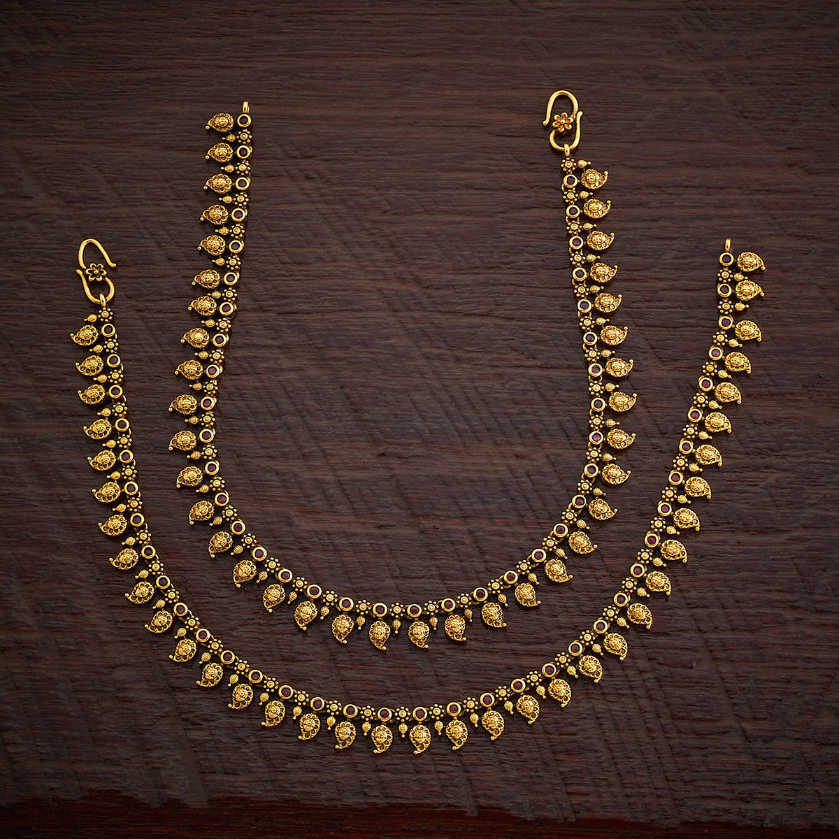 Add a sparkle that every woman needs with this vintage antique payal from Kushal's premium collection. The rich and decadent royal artistry influences this copper-alloyed ornament's unique and elegant style. Featuring an array of exquisite synthetic stones, the ornament will let you bask in the beauty of ruby/ ruby-green tone. Redefine your look and upgrade your style with this enchanting pair of jewels.
