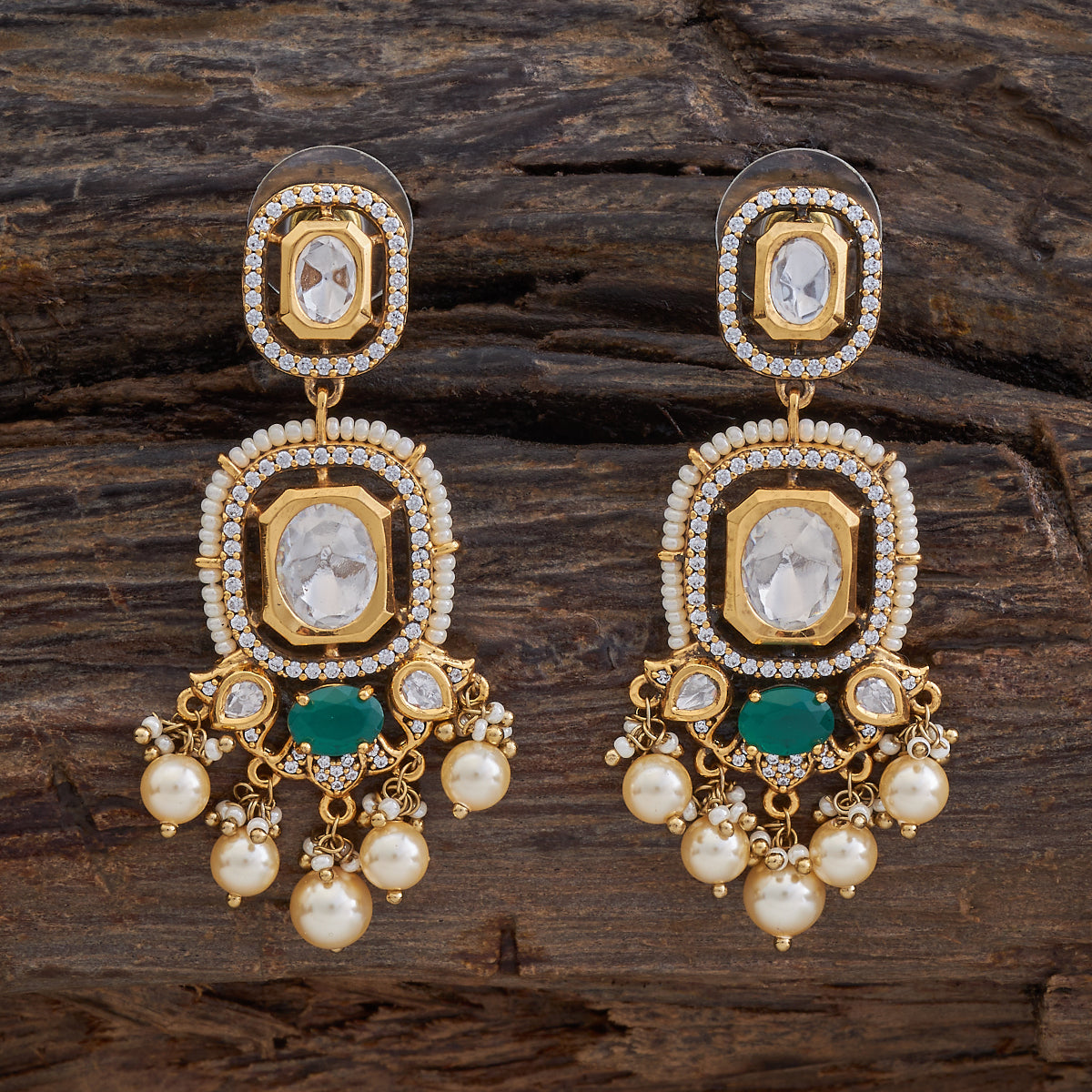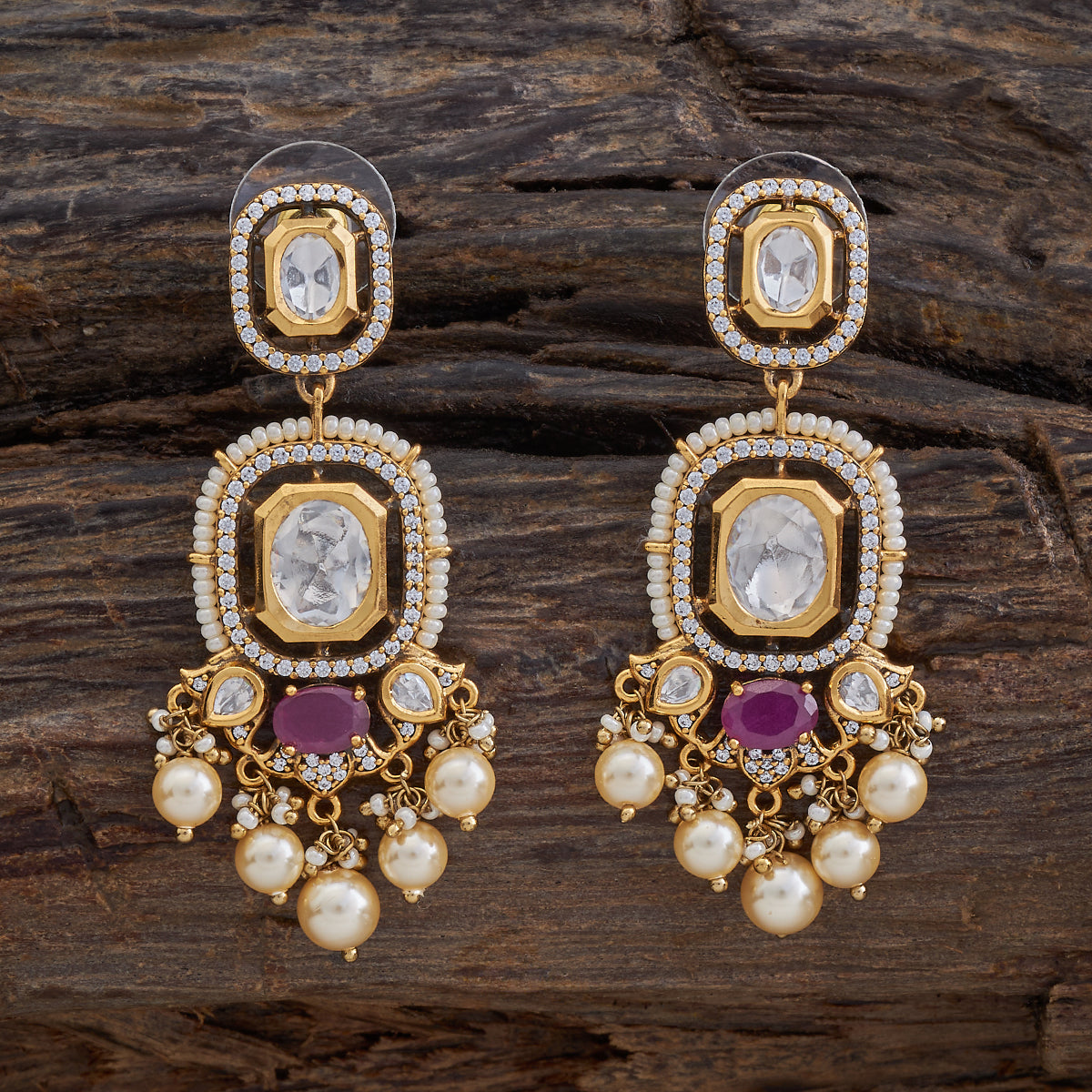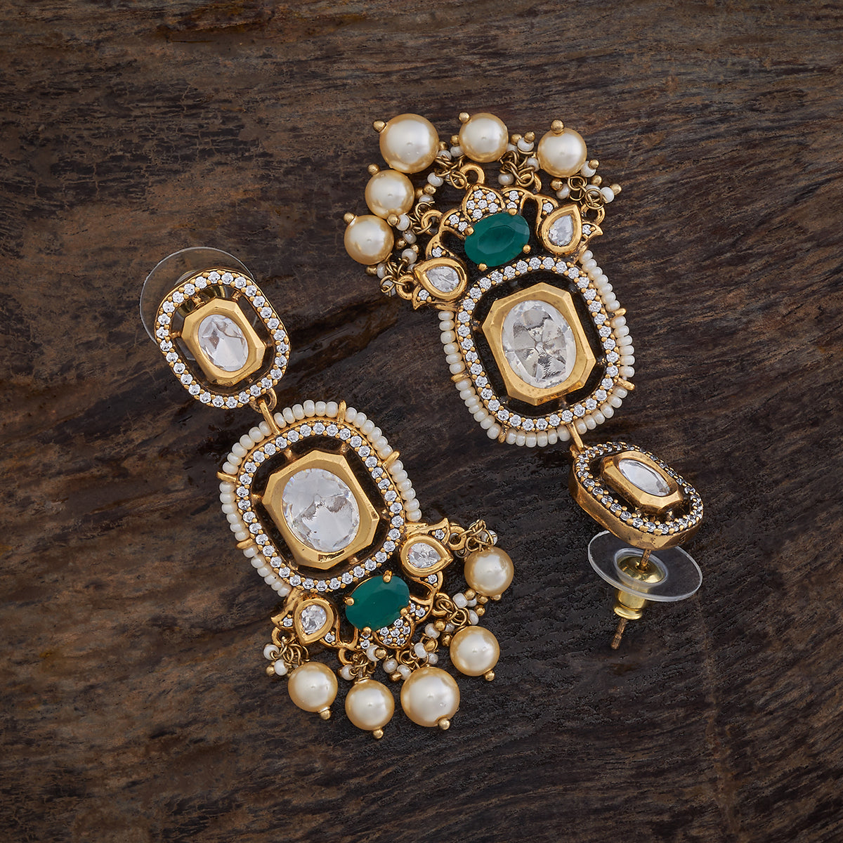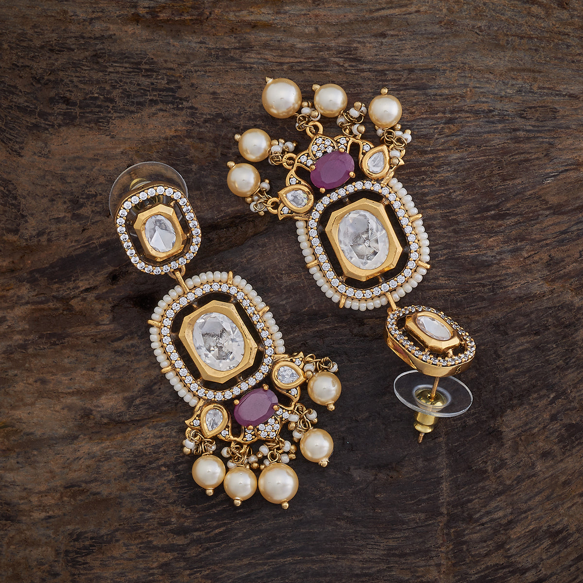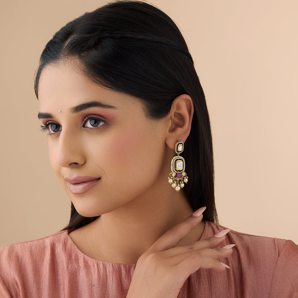 These Kundan earrings add a touch of timeless elegance to any outfit. Crafted from a lightweight copper alloy, gold detailing surrounds the coloured stones. It is available in two shades: green and ruby. Pair them with a simple kurta with mom jeans, along with open-toe sandals for a bohemian vibe.