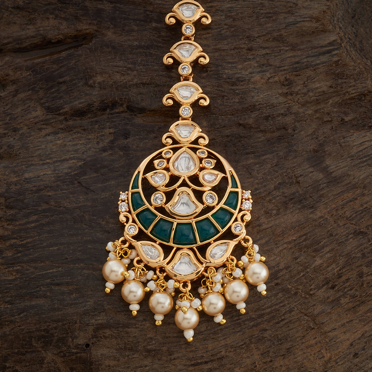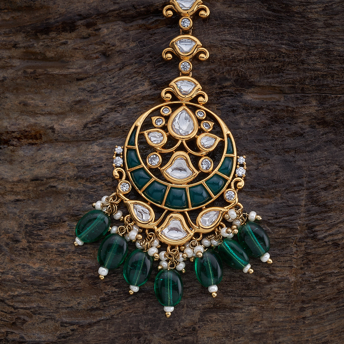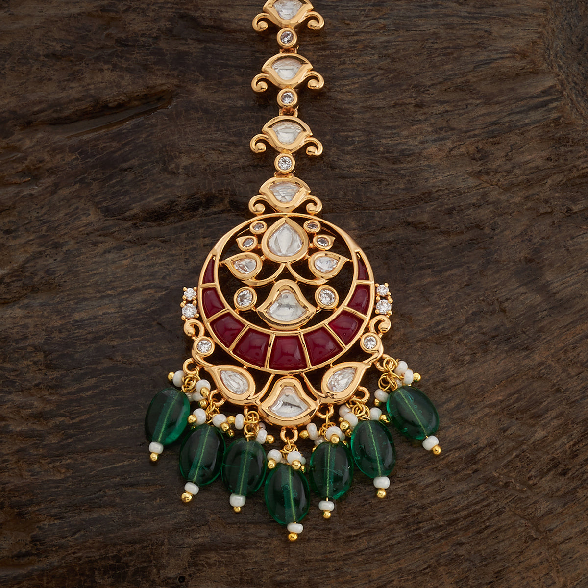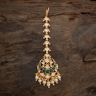 Complete your traditional ensemble with our Kundan Tikka, a forehead ornament that adds a touch of regal charm. The tikka features Kundan stones in a classic design in green, ruby and ruby-green stones in gold and victorian polish, creating a look that is both timeless and elegant. Elevate your ethnic look with this sophisticated Kundan Tikka.