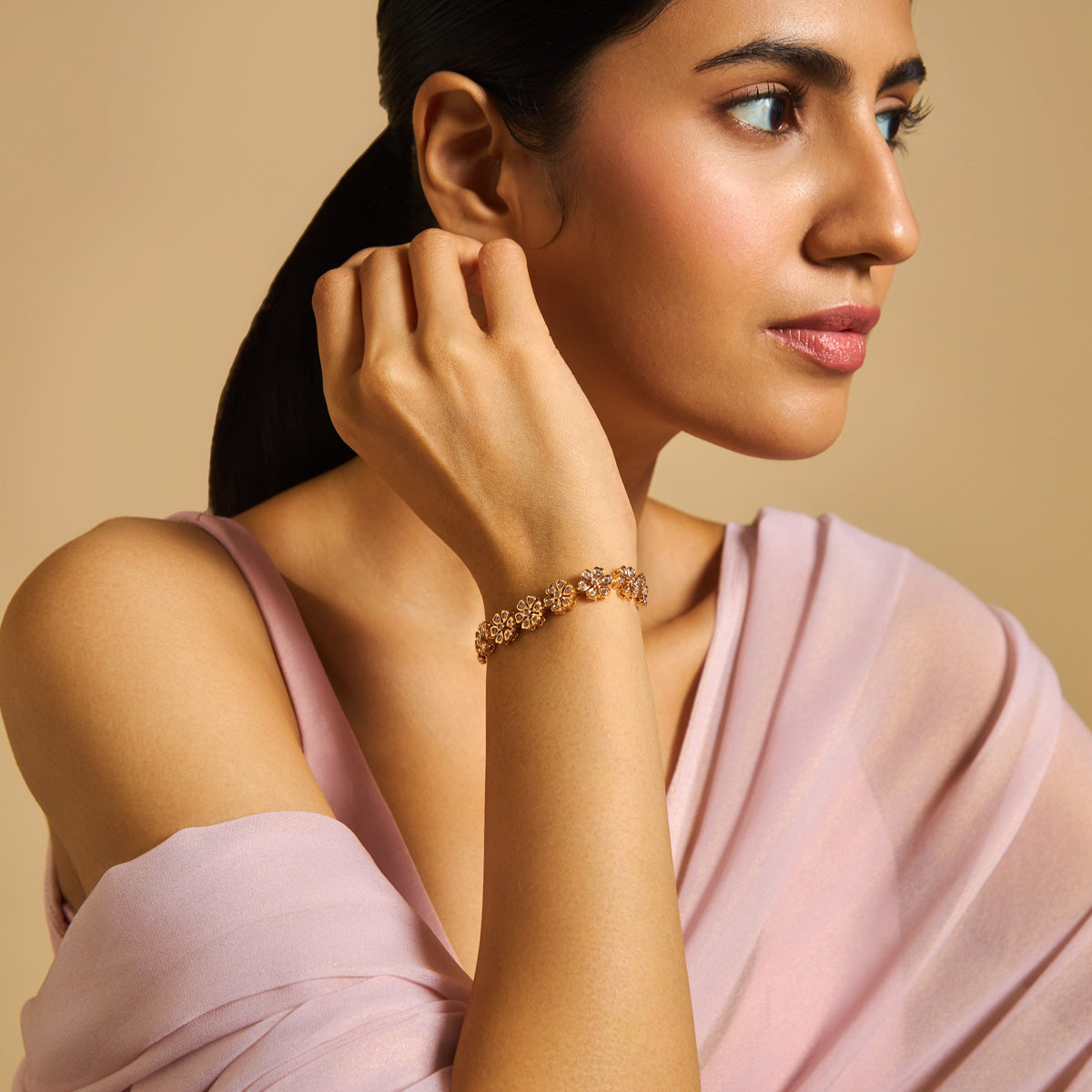 An elegant zircon bracelet is all you need to elevate your style whether you wear a traditional or Western outfit. Crafted with premium copper alloy, this bracelet has elegant white zircon stones arranged in a floral pattern. It has a chain-like closure which provides an elegant and lightweight wearing experience.