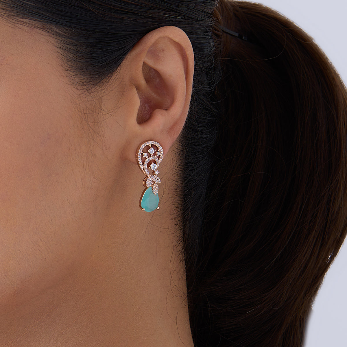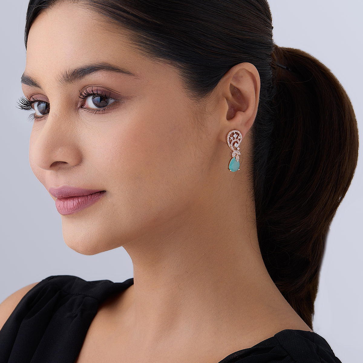Grab a pair of these stunning zircon earrings if you enjoy being in the limelight of every event. These hanging earrings, which have an exquisite design, have white zircon stones outside and green zircon in the center. Simple pull-back hairstyles and loose hair on the face go well with these earrings.