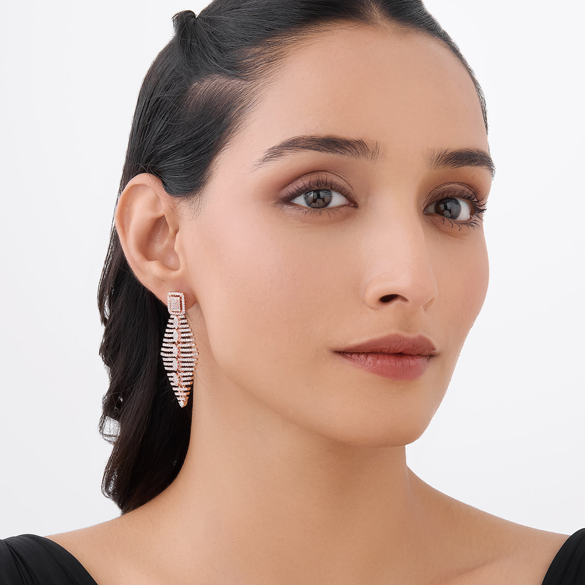 Hanging earrings blend well with all outfits and occasions, which ensures their secure place in the hearts of fashion lovers. Allow our latest pair of zircon hanging earrings to be the next favorite addition to your accessory collection. These earrings come in rodium and rose gold polish to help you find the perfect pair for your outfits.