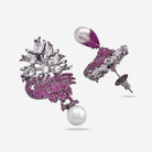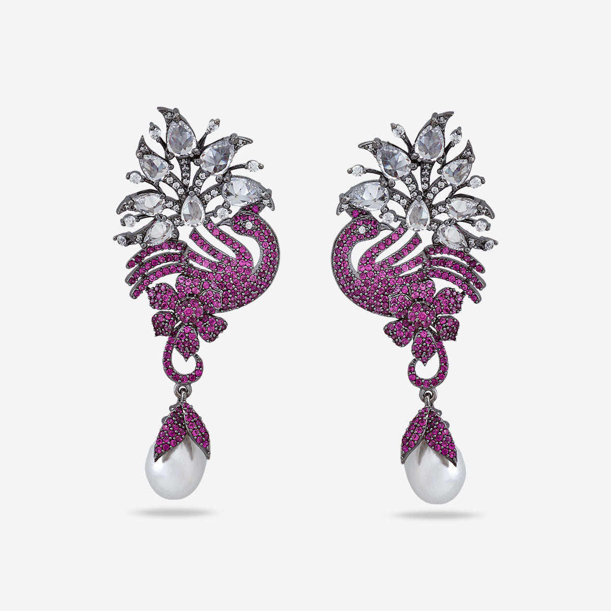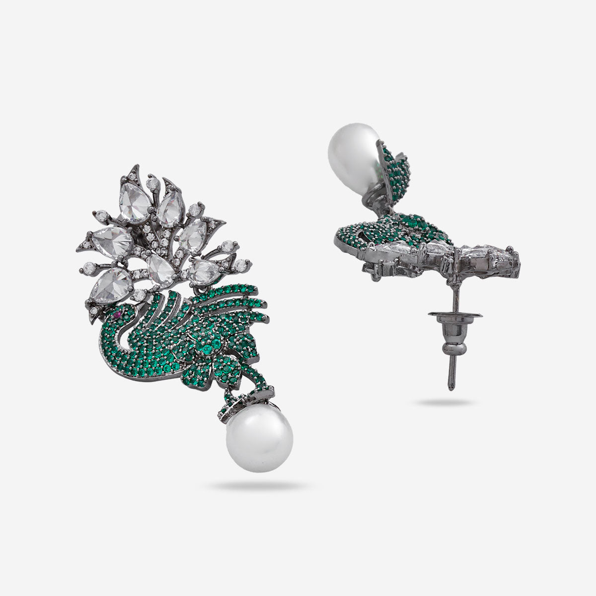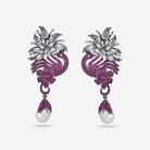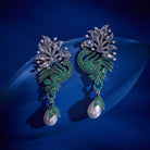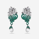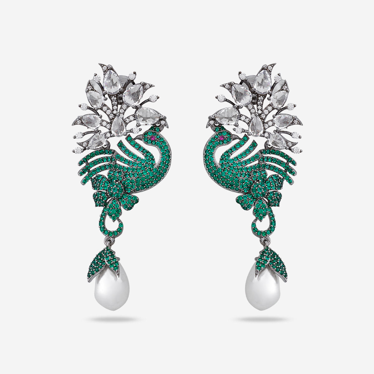 You must have seen numerous earrings while searching online, but we are sure none comes near our latest pair of zircon earrings. The brilliance of these hanging earrings comes from their peacock motifs heavily studded with green and ruby stones with black polish. Wear these earrings with matching accessories to be the centre of attraction at all events.