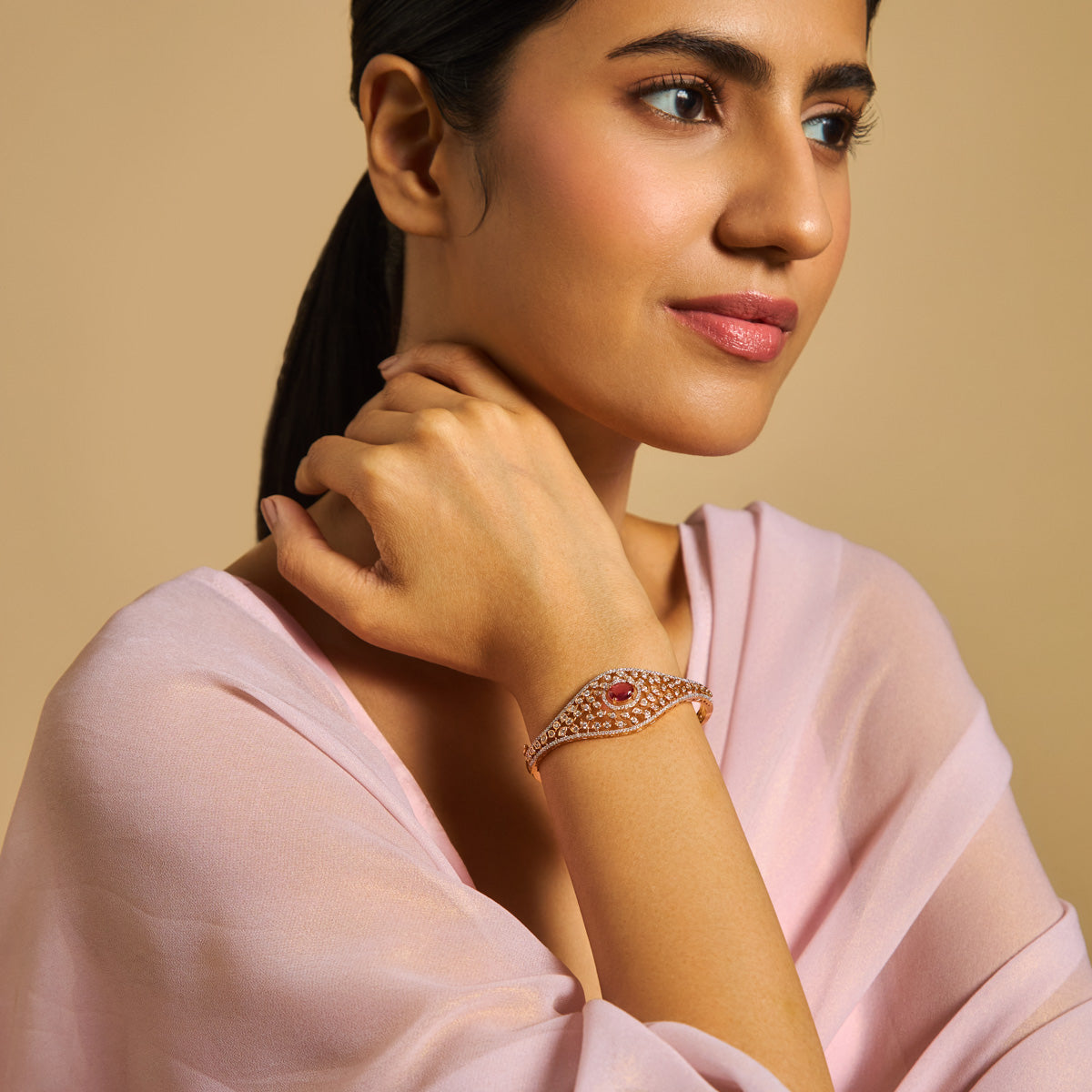 Add a pop of glam with Kushal's zircon kada, sparkling with vibrant zircon stones and a sleek rhodium-gold or rose-gold polish. Made from copper alloy and featuring a secure locking system, this bangle is available in multiple colour variations to choose from, perfect for jazzing up any look!