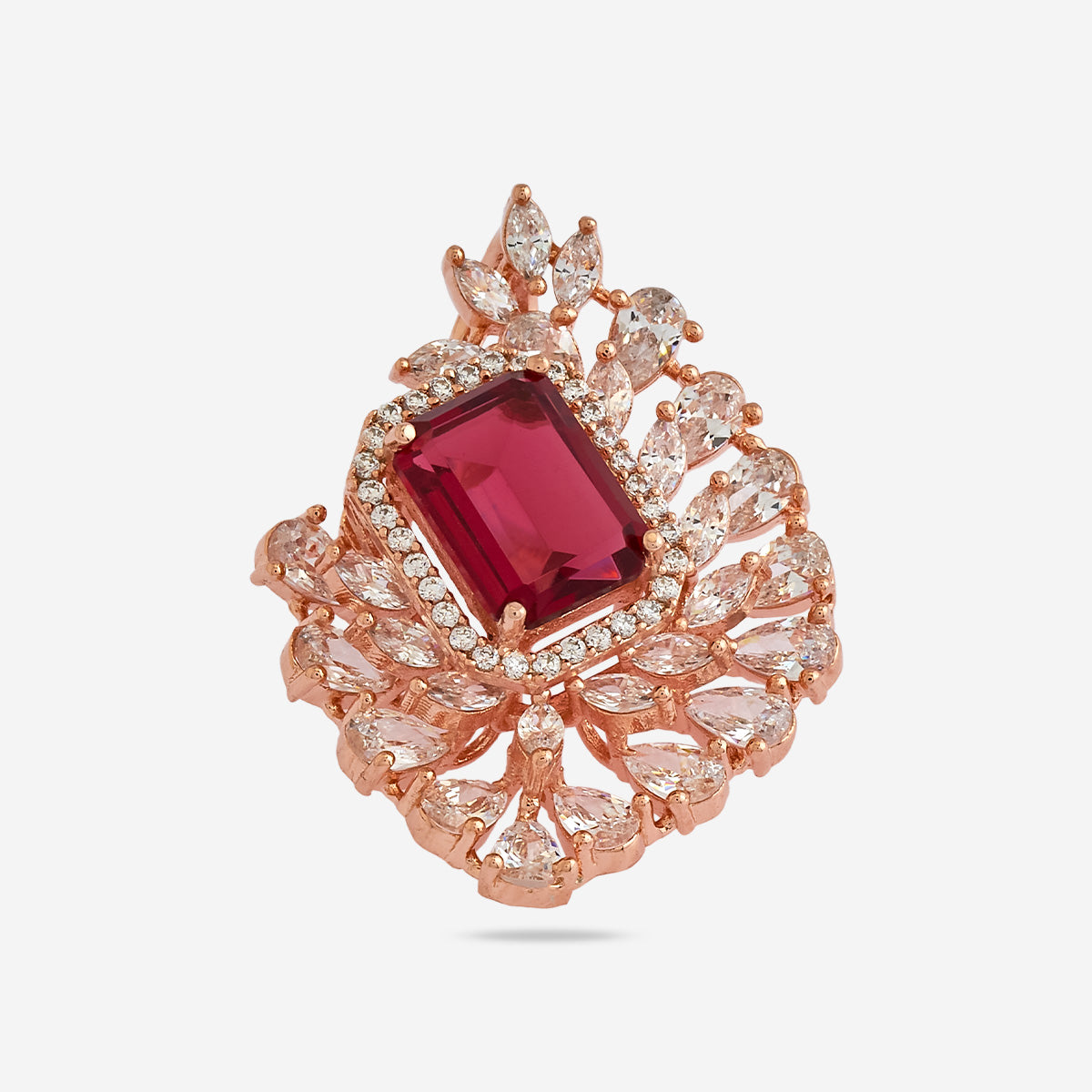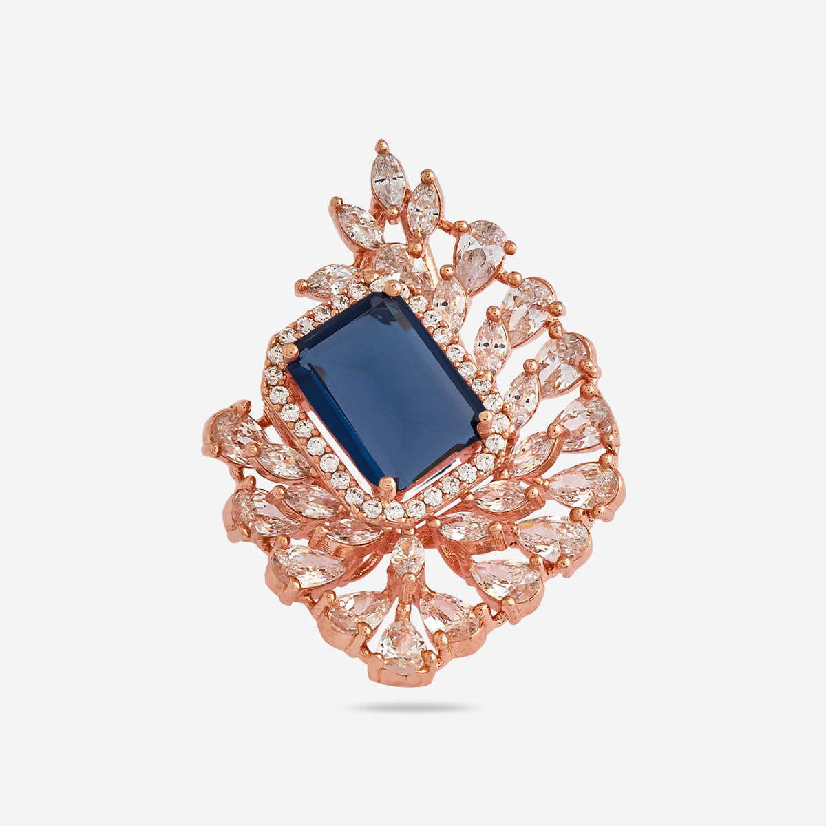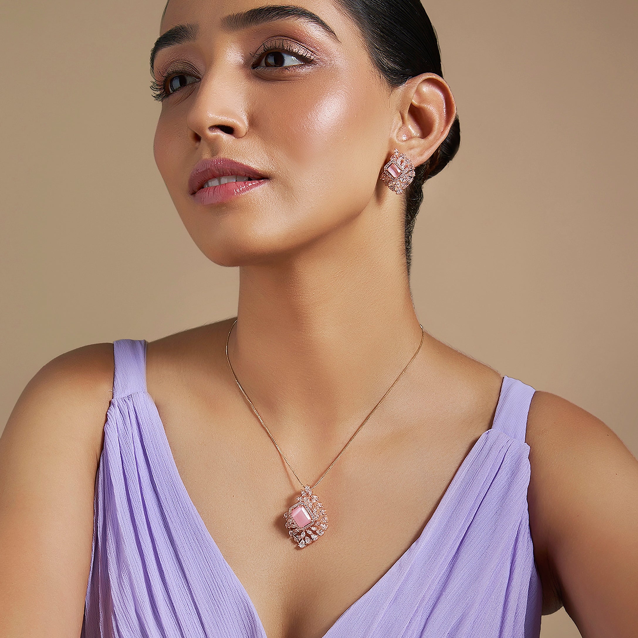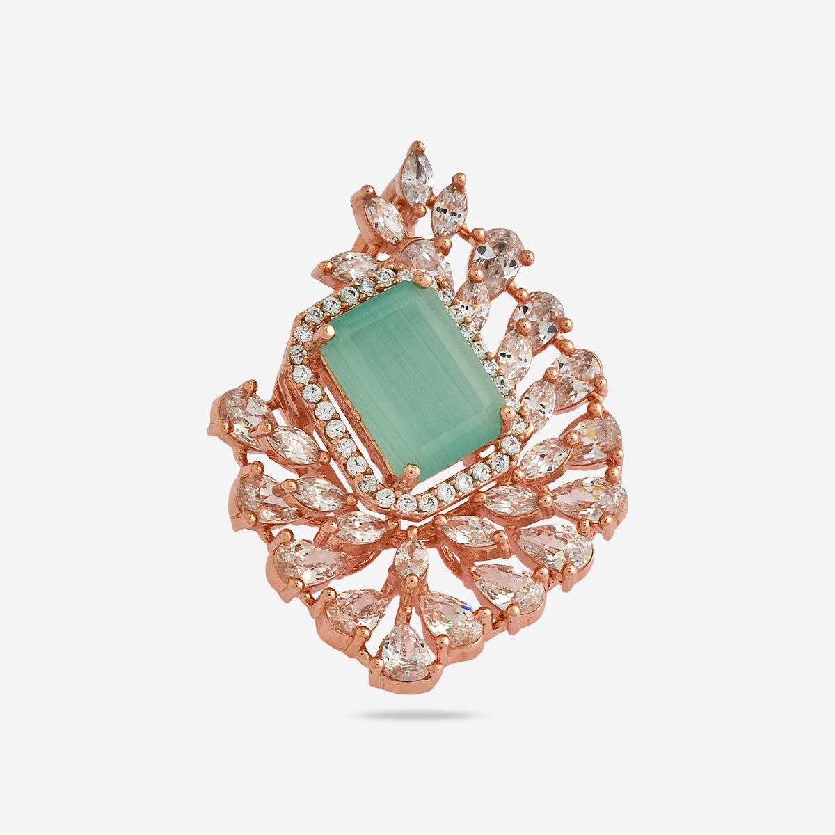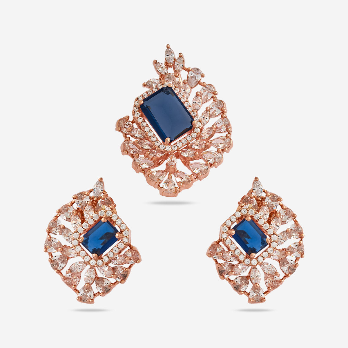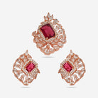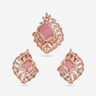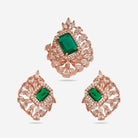 Enhance your look with our dazzling zircon pendant set in rose gold polish, designed to leave a lasting impression on anyone who lays eyes on it. This pendant set showcases zircon stones in five enticing colours- green, mint, pink, ruby, and sapphire, exuding beauty with every shimmer. Its heavy, refined look adds a touch of grandeur to any outfit, whether a simple suit salwar or simple saree, making it the perfect choice for your next party or celebratory event.